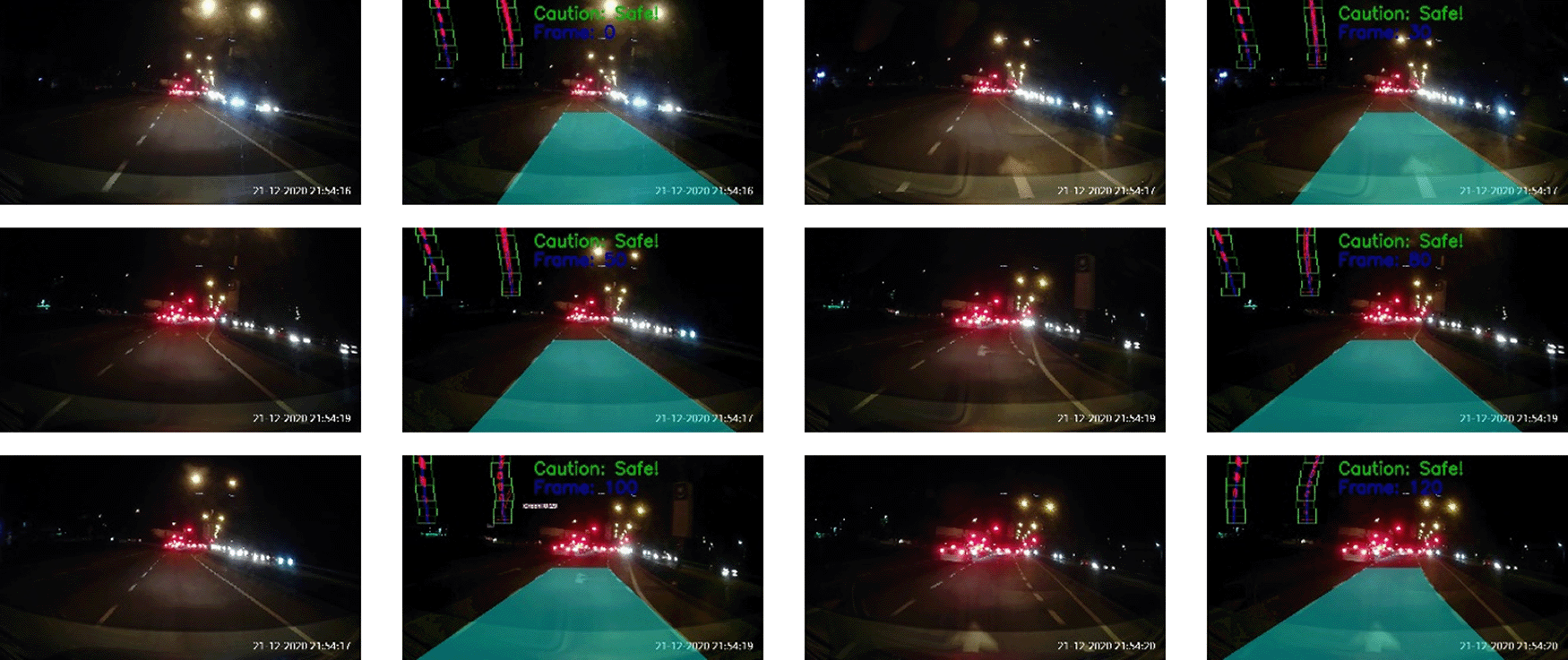 The results of the proposed method for different road conditions are presented in Figures 14 to 15. Figure 14 depicts the testing results on a normal road during the day. The results show a sequence of the ego car moving on the road (from top to bottom, left to right). Initially, there is a safe driving distance between the ego car and the forefront vehicles so the driving region is marked blue. However, as the ego vehicle draws nearer, the vehicle at the front (i.e. the white color car) starts to overlap with the safe driving region. Hence, a warning is triggered and the driving region is marked as red. Another scenario for normal road at night is illustrated in Figure 15. It can be observed that the proposed algorithm also works well during the night in estimating the safe driving region.