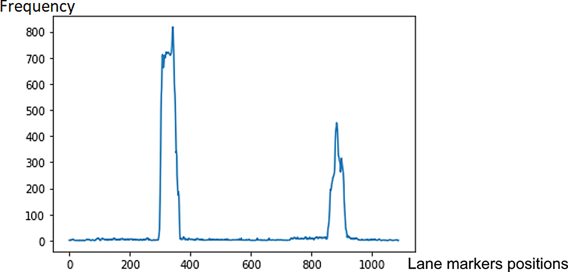 A sliding window approach is applied to detect the lane markers. In Figure 4b, the lane markers appear pretty straight after perspective transformation. We accumulate the pixel values in the vertical direction to detect possible lane marker locations in the image. Locations with the highest number of pixels signifies potential lane markers positions. The histogram for bottom part of Figure 4(b) is presented in Figure 5.