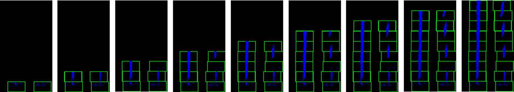 The peak values locations in the histogram determine the positions to form the initial windows at the bottom of the image (refer Figure 6). The windows locations are determined by the mean of the non-zero pixels values in the windows. Based on these initial windows, another window is drawn as the next sliding window, based on the mean points of the initial windows. The same process is repeated to slide the windows vertically through the image.