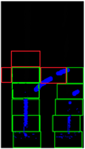 Therefore, we introduce an adaptive sliding window approach that keeps track of the “strength” of the line markers by checking the number of pixels in a window. The confidence level of the line pixels must exceed a minimum threshold value to qualify the existence of a line. If there is not enough evidence to show the existence of a line in the current window, three exploratory windows will be spawned, i.e. top, left and right, to check the existence of lines in the neighboring regions (refer to the three red windows in Figure 7).