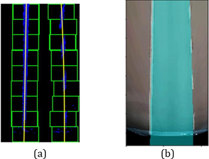 The points found using the mean values in the sliding windows are used as the control points to approximate the lane line curvature. The third-degree polynomial model7 is used to fit the points on the sliding window as it has simple parameters and has a lower computational cost. Figure 8(a) shows the lane line fitted by the polynomial curve. The fitted region is filled with blue color to highlight the lane region as illustrated in Figure 8(b). Figure 9 depicts the filled lane region that has been warped back to the original perspective view.
