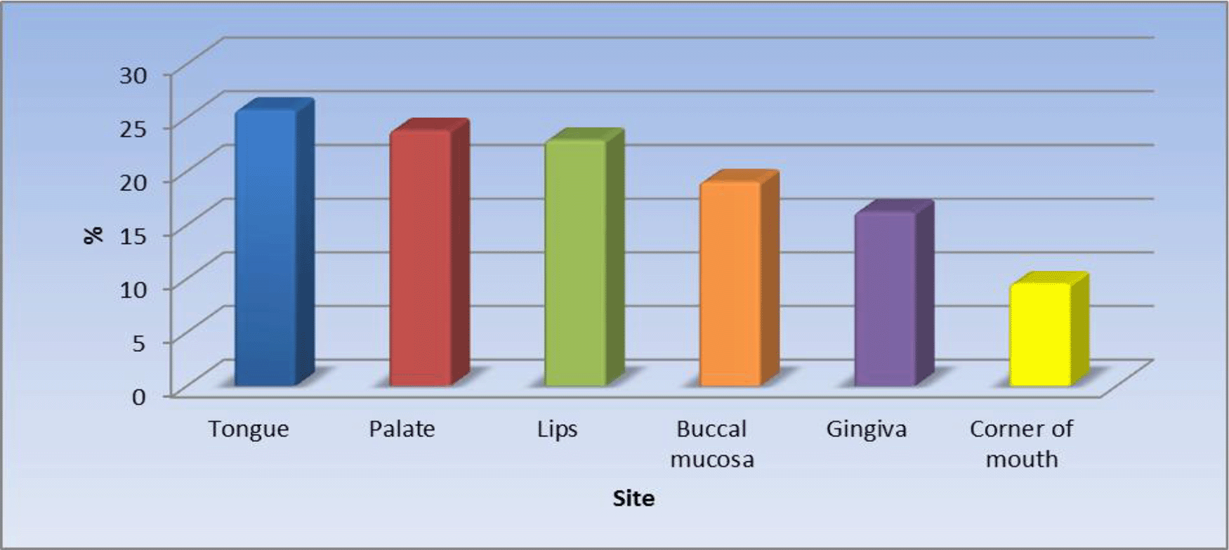 The results of the current study revealed that the most affected site was the tongue (25.7%) in just over one-quarter of the patients followed by the palate, lips, buccal mucosa, the gingiva, and the least affected site was the corner of the mouth. Khatibi et al., in 2012, revealed that the sites most commonly affected by oral lesions were the buccal mucosa and the lips.6 A Brazilian study reported that the more frequently affected sites were the buccal mucosa then the hard palate and lower lips.1 While another study found that the commonest site was the hard palate.17 This variation may be attributed to dissimilarity in the exclusion and inclusion criteria of these studies.