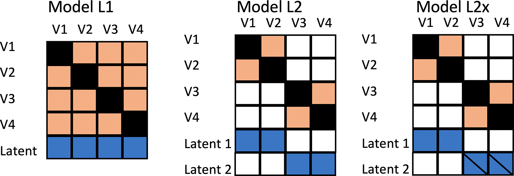 The initial simulation, designated as Model L1, treated all outcome measures as equivalent. In practice, of course, we will observe different effect sizes for different outcomes, but in Model L1, this is purely down to the play of chance: all outcomes are indicators of the same underlying factor, as shown in the heatmap in Figure 1, Model L1.