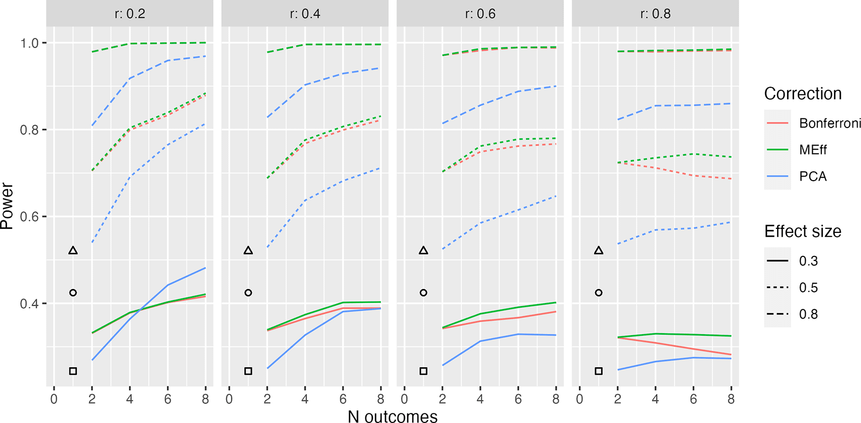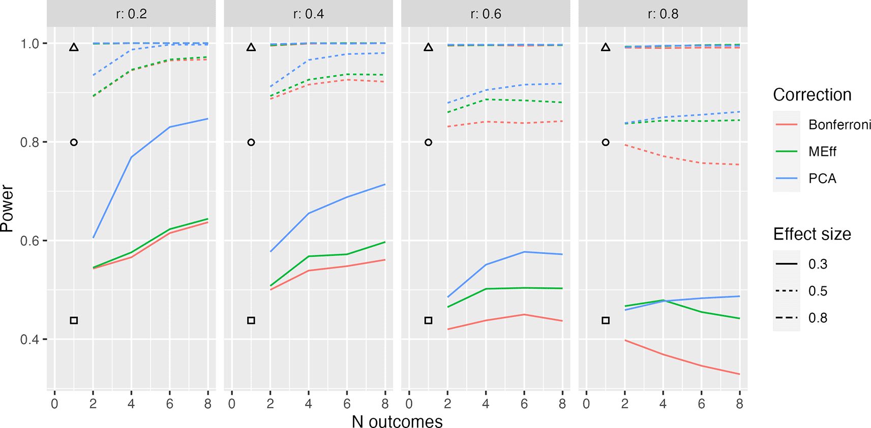 The simulations showed that PCA gives higher power than MEff in the case where all outcomes are indicators of a single underlying factor. PCA, however, needs to be computed from raw data and so is not feasible when re-evaluating published studies, whereas MEff is feasible so long as the average off-diagonal correlation between outcomes can be estimated. PCA is also less powerful when the outcomes tap into heterogeneous constructs and do not load on one major latent factor.