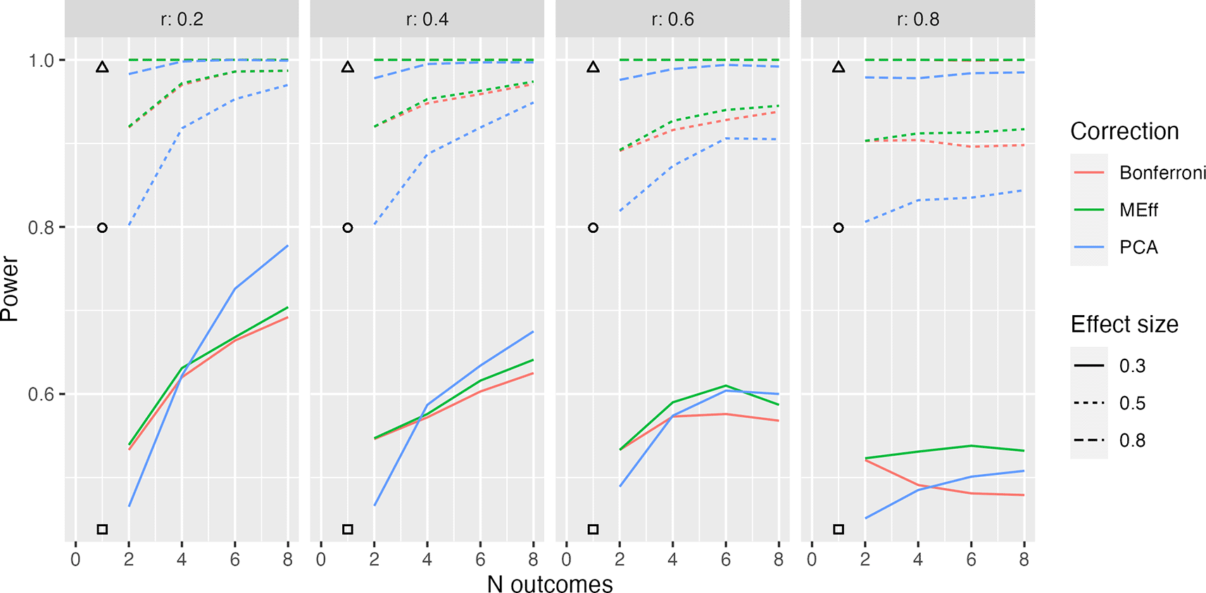 In sum, a recommendation against using multiple outcomes in intervention studies does not lead to optimal study design. Inclusion of several related outcomes can increase statistical power, without increasing the false positive rate, provided appropriate correction is made for the multiple testing. Compared to most other approaches for correlated outcomes, MEff is relatively simple. It could potentially be used to reevaluate published studies that report multiple outcomes but may not have been analysed optimally, provided we have some information on the average correlation between outcome measures.