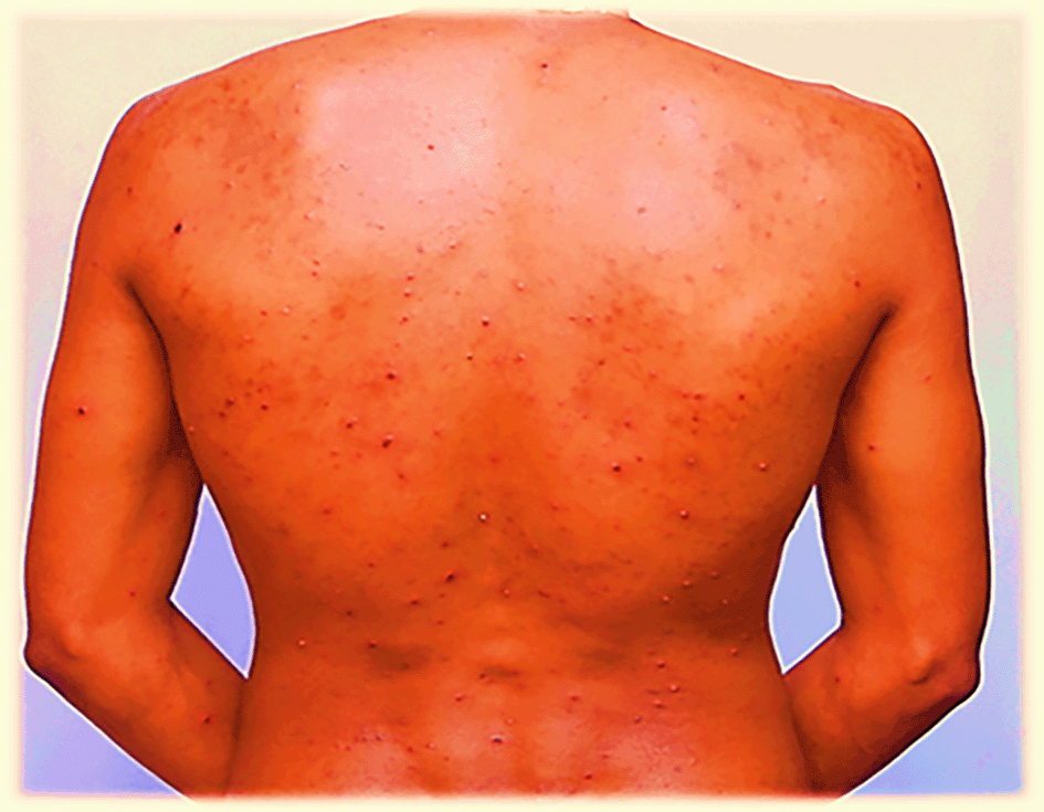 Figure 1. Red rash with ruptured lesions on the back, especially at the scapulae and lower back of the patient.