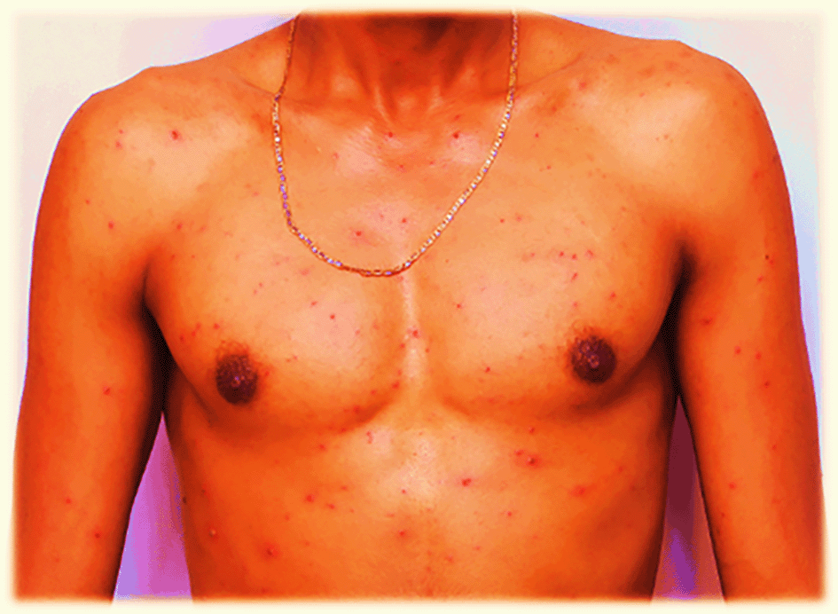 Figure 2. Red rash with ruptured lesions on the anterior body, especially on and around the chest of the patient.