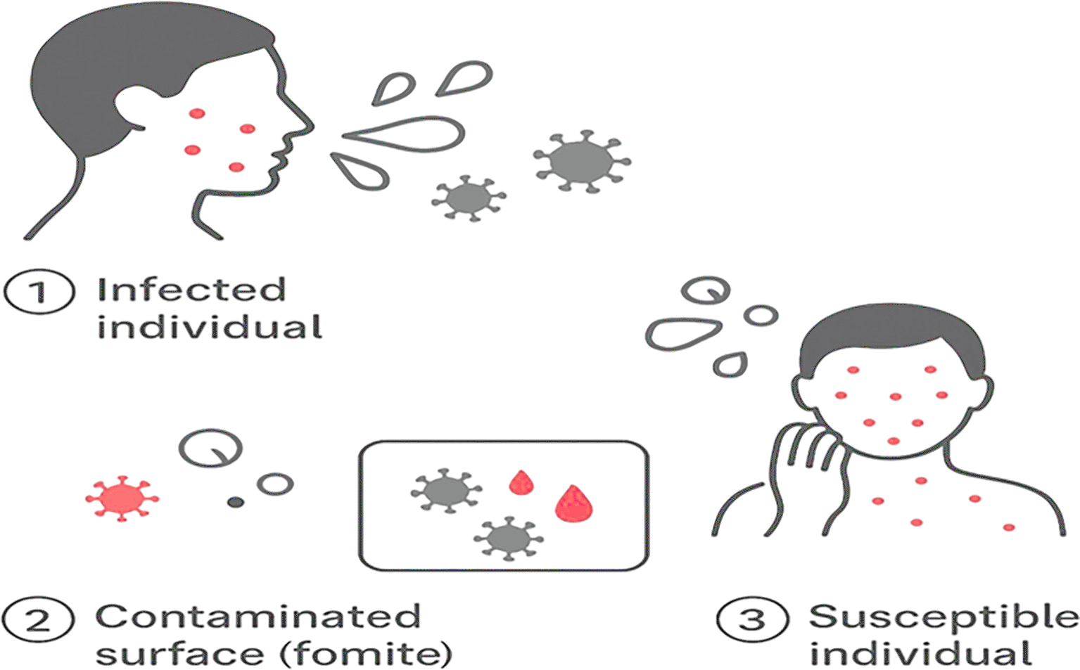 (1) Infected individual: A contagious person sheds varicella-zoster virus (VZV) through respiratory droplets or vesicular fluid, releasing viral particles into the environment. (2) Contaminated surface (fomite): Viral droplets settle on nearby objects such as bedrails, clothing, or medical instruments, allowing VZV to persist for hours under favorable conditions. (3) Susceptible individual: A non-immune person contacts the contaminated surface and subsequently touches the contaminated surfaces or fomite, leading to self-inoculation and infection.