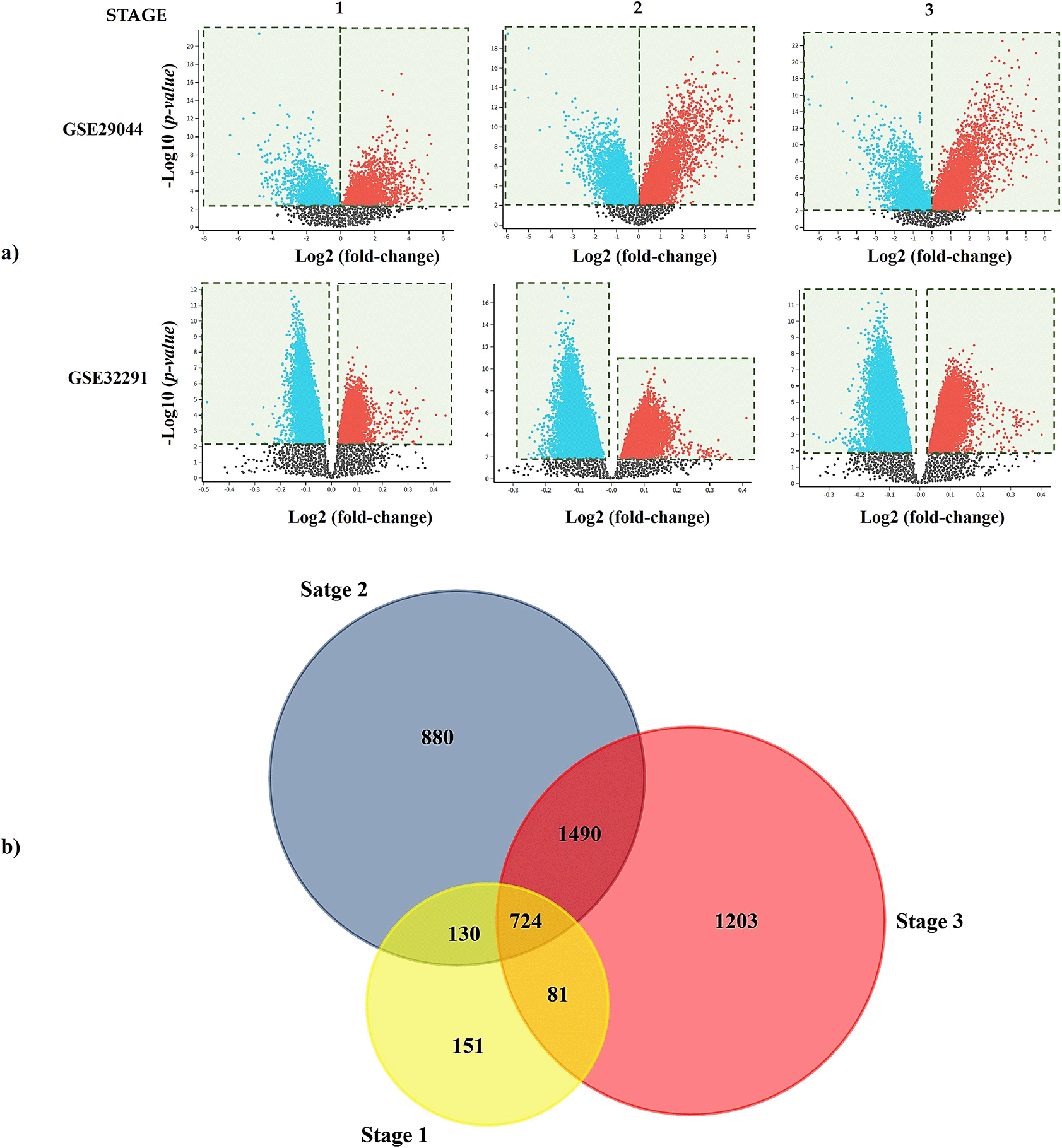 a) Volcano plots obtained in GEO2R show the difference in gene expression between tissues of IDC and controls. The X and Y-axis represent the fold-change and the P-value (log-scaled). Each symbol represents a different gene; red and blue symbols represent upregulated and downregulated genes. b) Venn diagram showing the shared genes per stages assayed. DEG, differentially expressed gene; IDC, invasive ductal carcinoma.