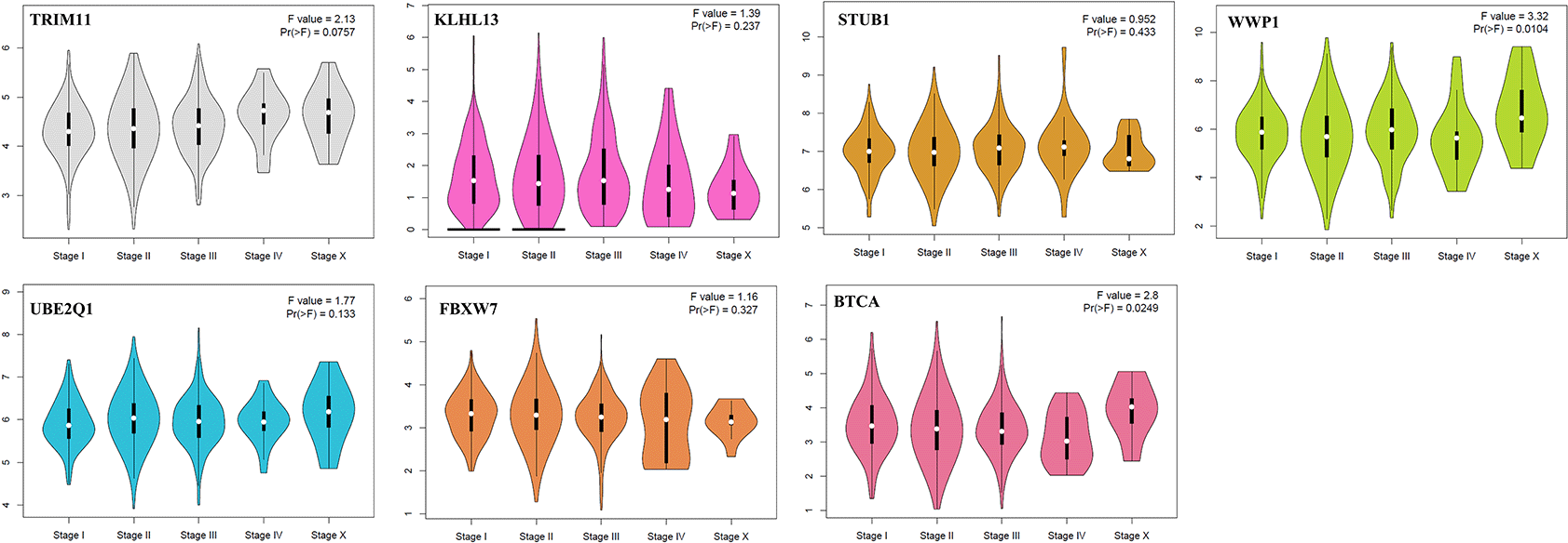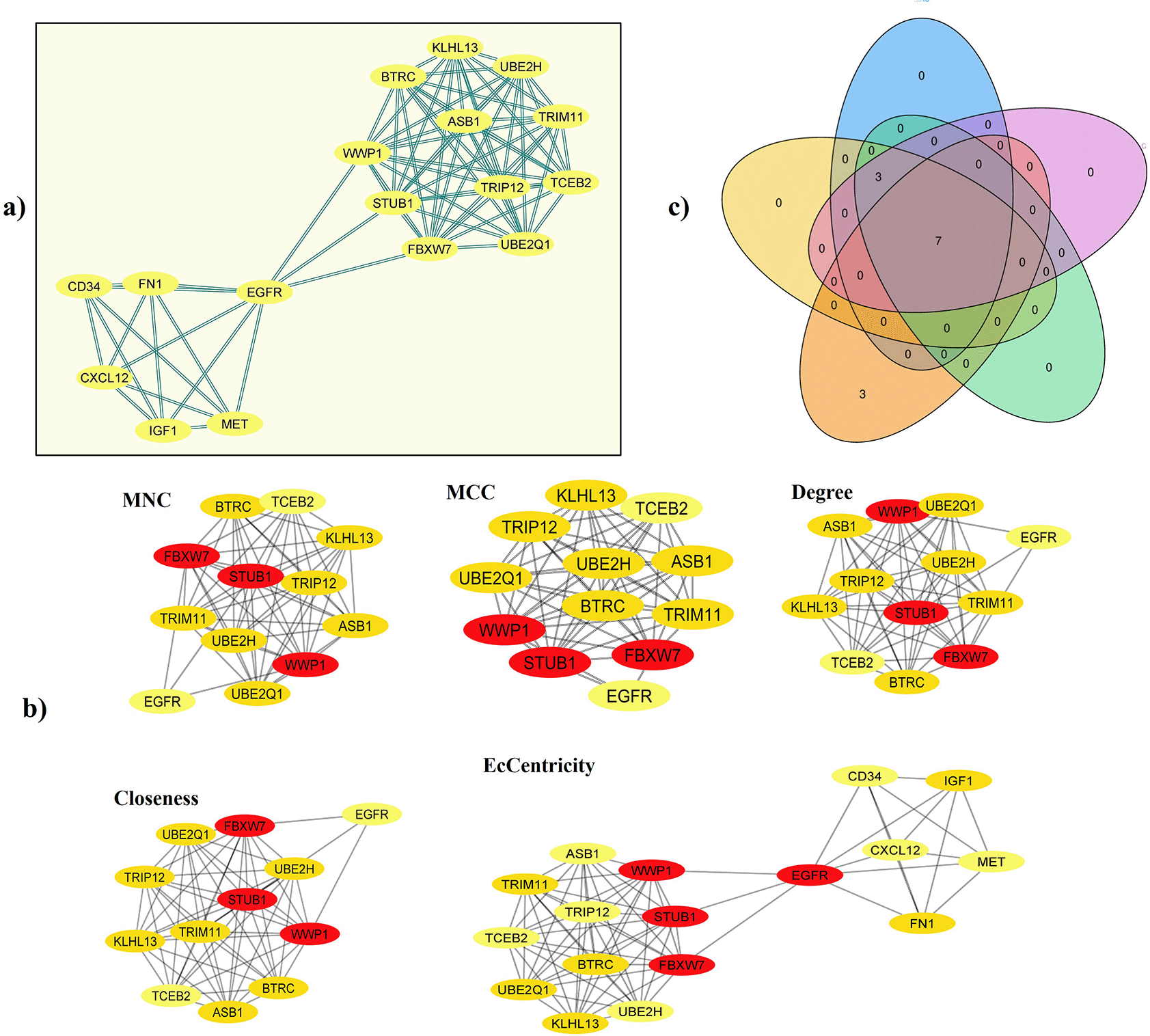 WW domain-containing E3 ubiquitin-protein ligase 1 (WWP1), STIP1 homology and U-box containing protein 1 (STUB1), F-box and WD repeat domain containing 7 (FBXW7), kelch like family member 13 (KLHL13), ubiquitin-conjugating enzyme E2 Q1 (UBE2Q1), tripartite motif-containing 11 (TRIM11), beta-transducin repeat containing E3 ubiquitin-protein ligase (BTRC), ubiquitin conjugating enzyme E2 H (UBE2H), thyroid hormone receptor interactor 12 (TRIP12), ankyrin repeat and SOCS box containing 1 (ASB1), epidermal growth factor receptor (EGFR), fibronectin 1 (FN1), insulin-like growth factor 1 (IGF1), Maximum Neighborhood Component (MNC), Maximal Clique Centrality (MCC), protein-protein interaction (PPI).