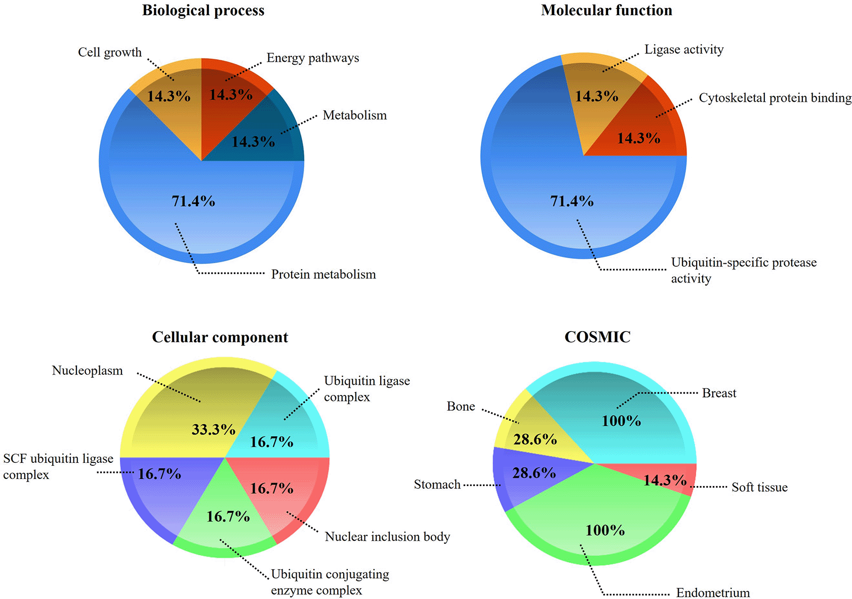 Enrichment analysis of hub genes was developed in FunRich, classifying them by their ‘biological process’, ‘molecular function’, ‘cellular components’, and the ‘Catalogue of Somatic Mutations in Cancer (COSMIC)’ (RRID:SCR_002260). The results obtained showed that hub genes were mainly enriched in “protein metabolism”, “metabolism”, “cell growth” and “energy pathways”; in turn, among the main molecular functions, analyzed by KEGG pathways showed that hub genes were mainly enriched in “Ubiquitin-specific protease activity”, “cytoskeletal protein binding”, and “ligase activity”; these were associated with the main cellular components where genes are found (“nucleoplasm”, “ubiquitin ligase complex”, “SCF ubiquitin ligase complex”, “ubiquitin conjugating enzyme complex” and “nuclear inclusion body”). Finally, according to COSMIC, the “breast”, “endometrium”, “stomach”, “bone”, and “soft tissue” were the primary site of action of the hub genes (Figure 3).27,28
