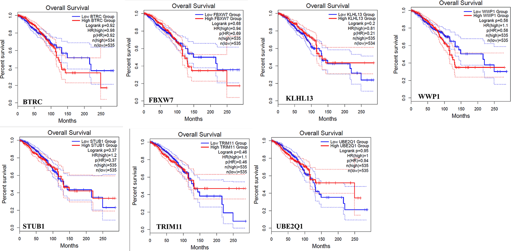 IDC, invasive ductal carcinoma; GEPIA, Gene Expression Profiling Interactive Analysis; WWP1, WW domain-containing E3 ubiquitin-protein ligase 1; STUB1, STIP1 homology and U-box containing protein 1; FBXW7, F-box and WD repeat domain containing 7; KLHL13, kelch like family member 13; UBE2Q1, ubiquitin-conjugating enzyme E2 Q1; TRIM11, tripartite motif-containing 11; BTRC, beta-transducin repeat containing E3 ubiquitin-protein ligase.