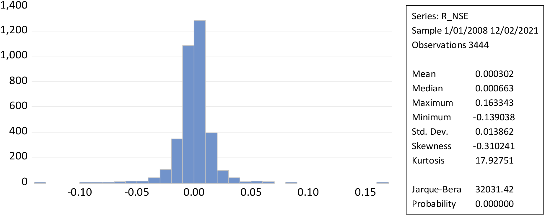 Figure 2 illustrates that leptokurtic statistical distributions with kurtosis larger than three result in a greater degree of stock market volatility. While the daily return of the NSE’s Jarque-Bera (32031.42) measures the market’s high volatility, the form of the curve, the magnitude of kurtosis, and the low probability value suggest that it may be possible to reject the null hypothesis.