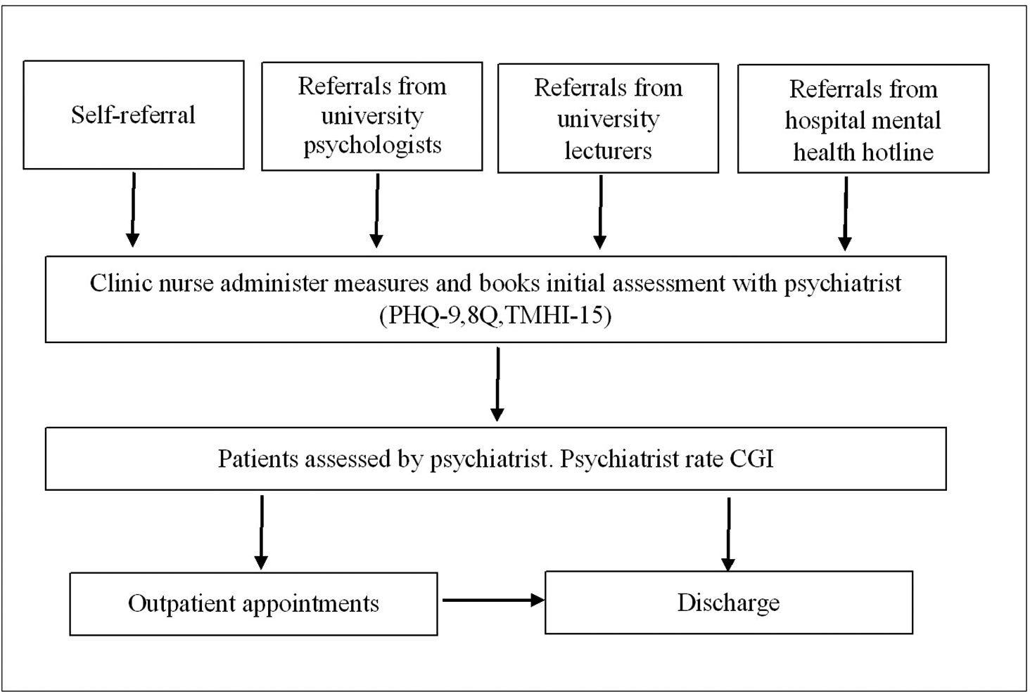 “Supara” mental health clinic is a specialised in-house clinic that provides mental health service for students and staff of Navamindradhiraj University. This clinic was established and implemented in 2020 by the department of psychiatry, Faculty of Medicine Vajira Hospital, which is affiliated with Navamindradhiraj University. The clinic intended to increase access to mental health services for university students by addressing confidentiality, privacy, and waiting time. There are psychologists, mental health nurses, and psychiatrists who provide comprehensive mental health evaluation and treatment (Figure 1).