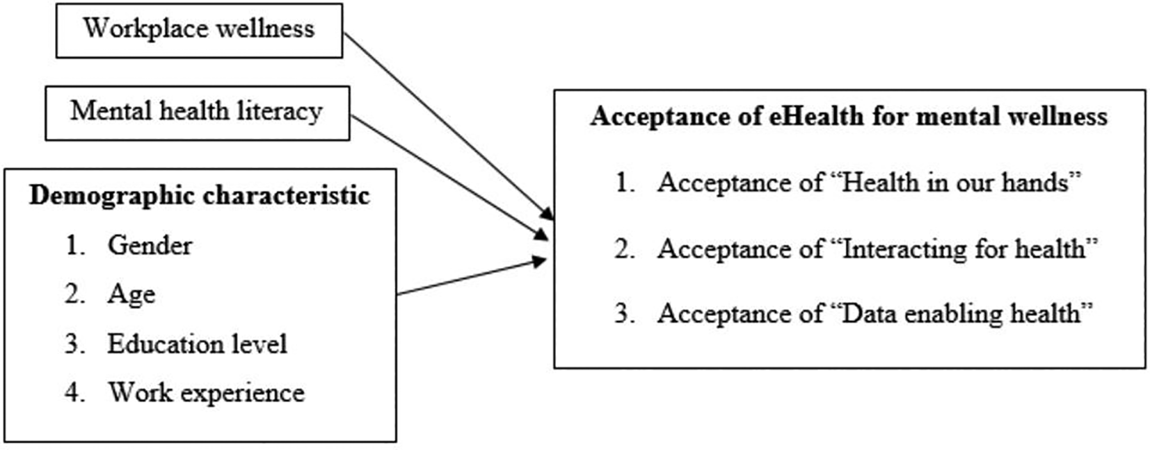Knowledge of eHealth has been associated with higher levels of its acceptance.5,13 Inadequate mental health literacy was identified as a key barrier to seeking help among those with mental health issues. Severity of stress symptoms can be a key determinant of the acceptance of stress-management apps.1 However, there is no clear evidence to link stress to the acceptance of e-mental health.2 The evidence on the influence of eHealth intervention acceptance is inconsistent and differs for various reasons, such as the culture of the study target groups. To address this research gap, we examined the acceptance of EHMW among digital workers in Malaysia and how demographic profiles, mental health literacy and workplace wellness influence acceptance of EHMW. The conceptual framework of this study is depicted in Figure 2.