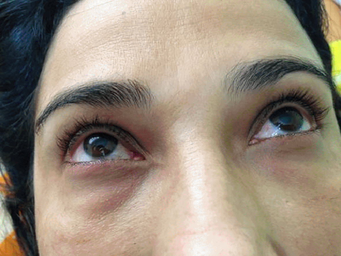 A 47-year-old woman (white, photographer) reported in January 2009, the onset of pain and bilateral tearing in the eyes at 35 years of age and was diagnosed with glaucoma. The patient began clinical treatment, but intraocular pressure remained 35 to 40 mmHg even with the use of four eye medications in the form of drops. She sought 13 ophthalmologists to undergo surgery for glaucoma, but none was willing to perform surgery due to the excessive edema. At 36 years of age, the patient sought a clinic for the treatment of lower limb varicose veins. CEAP C2 and hyperemia with periorbital edema were findings that drew the attention of the health team. The patient reported that her vision was always blurred despite the use of the eye drops (Figure 1). The patient was submitted to the Godoy & Godoy method of cervical lymphatic therapy to reduce the edema (Figure 2), which resulted in an improvement in the first session. This therapy consists of gentle elongating movements of approximately 0.5 cm on the skin surface, supraclavicular neck, at a rate of 30 movements per minute, for 20 minutes per day (Figure 3).