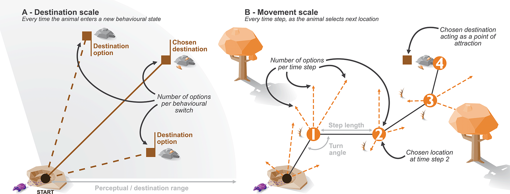 The model simulates animal locations over a given period of time at discrete time steps. At each time step, the agent (i.e., simulated animal) is presented with a range of movement options in the form of new locations [ Figure 1], and will choose from amongst these (i.e., sum-based model as opposed to facing a series of sequential binary decisions, see Ref. 2 for an example of the latter). The possible movement options, and how the new location is selected, are influenced by several factors: behavioural state of the animal, environmental quality, and proximity to points of attraction/avoidance. By simulating these drivers of animal movement, we hope to capture aspects of the internal state (i.e., motivation to move via behaviour); motion capacity (i.e., the individual’s varying ability to move); navigation capacity (i.e., ability to plan ahead beyond the immediate movement distance); and external factors (i.e., the landscape that steers and limits movement), all of which are defined as key components of animal movement.49,60
