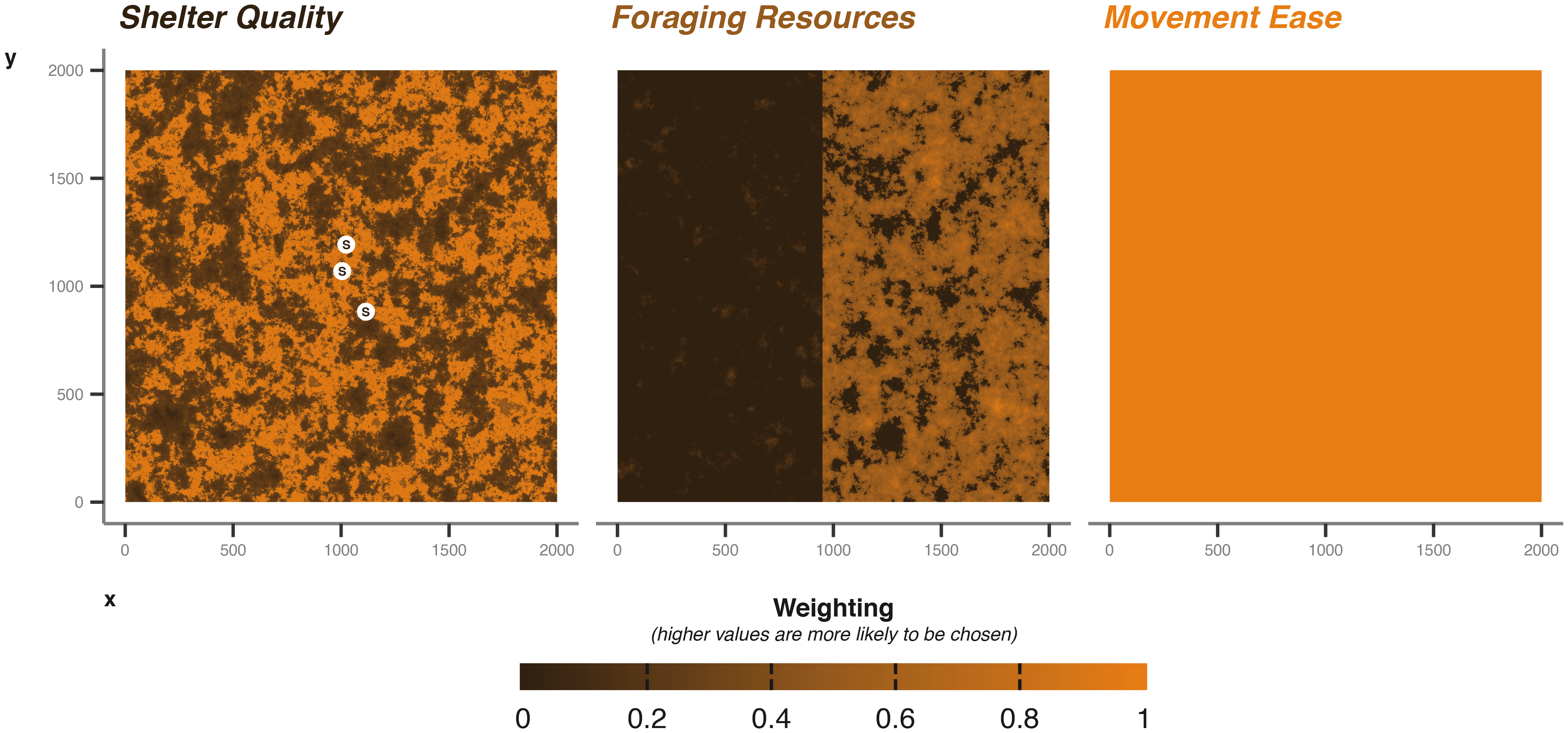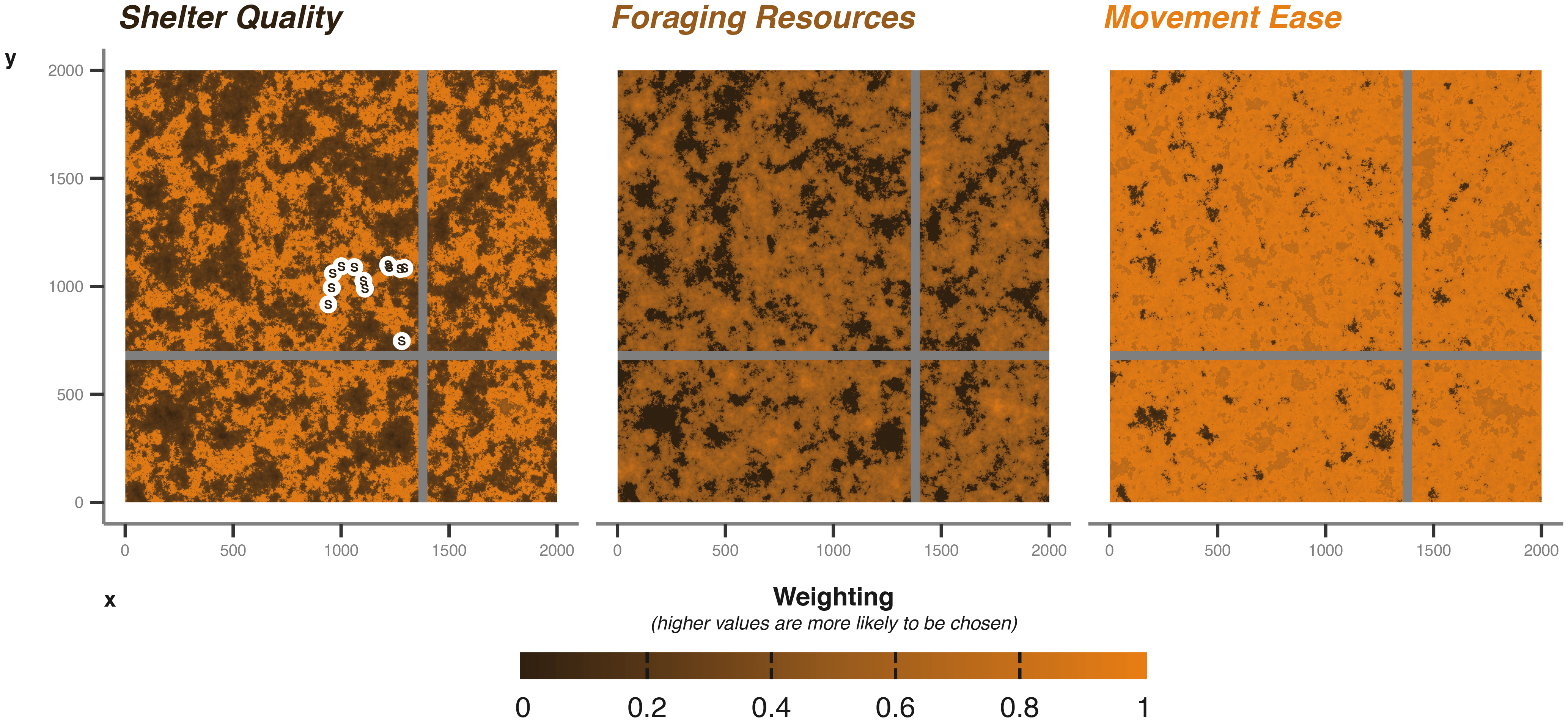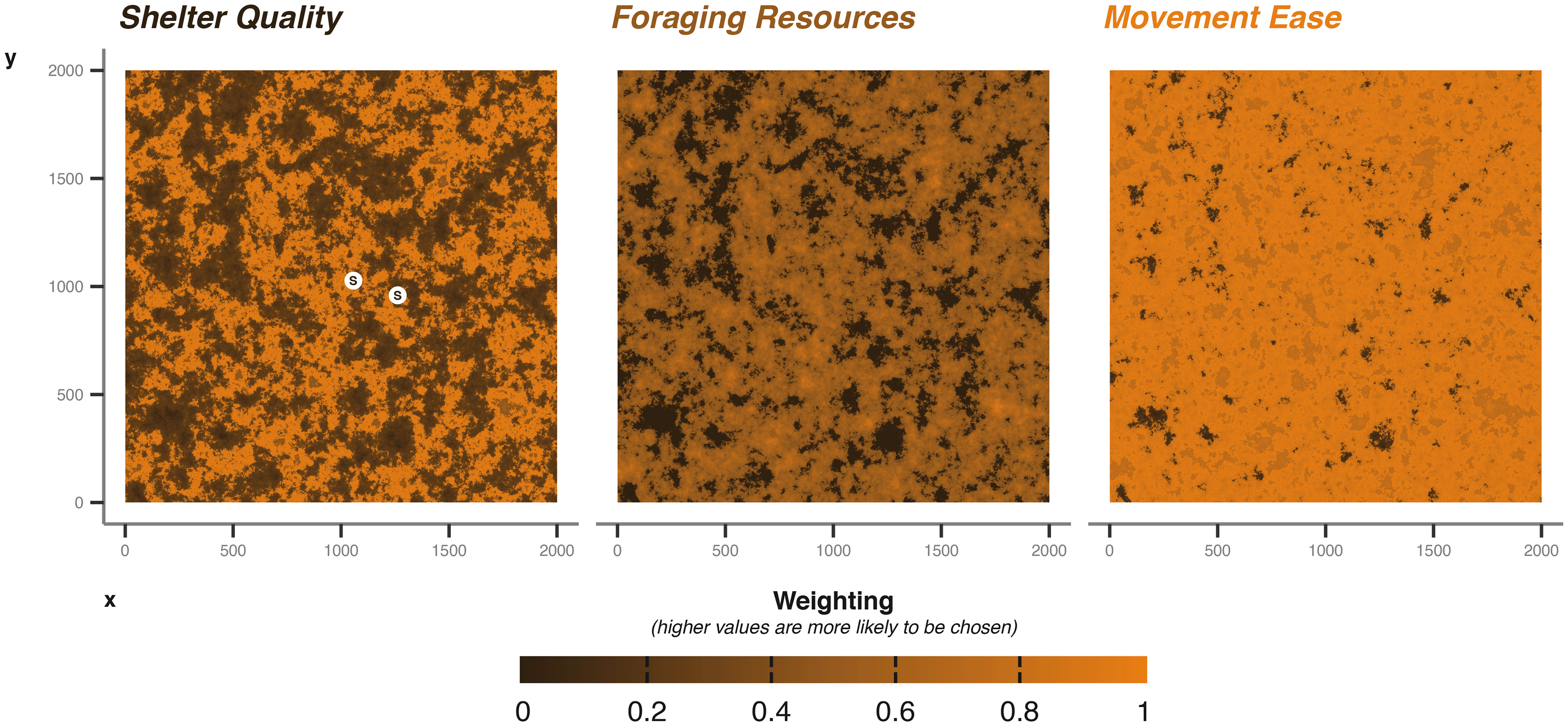 The interplay between shelter sites, foraging quality, and movement resistance simulates the site fidelity required for home ranges, while allowing the environment to help shape the size and diffusion of that home range. Simulating a more dynamic and messy array of movements can help test how far assumptions of uniform circular animal movement are practical.