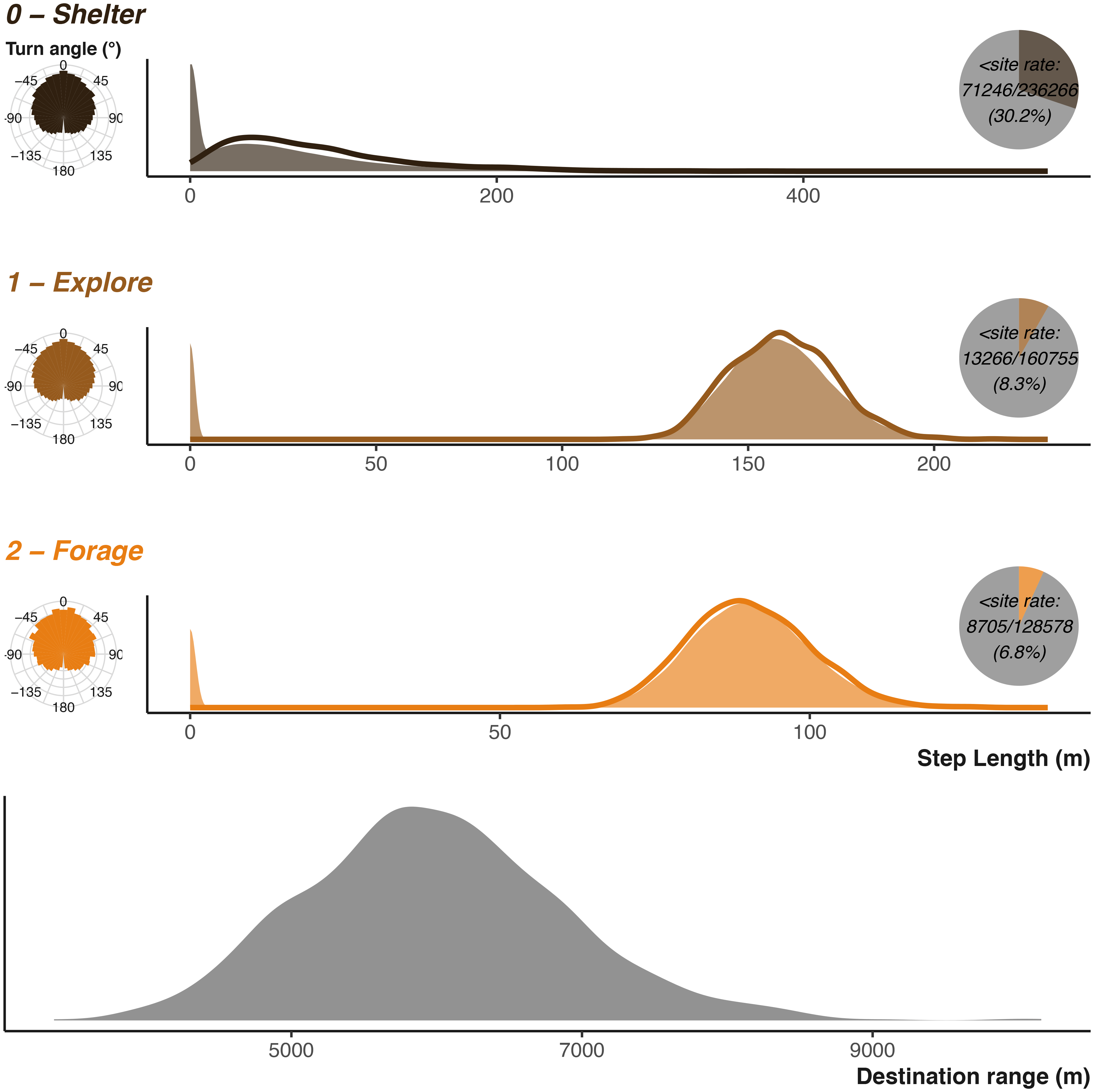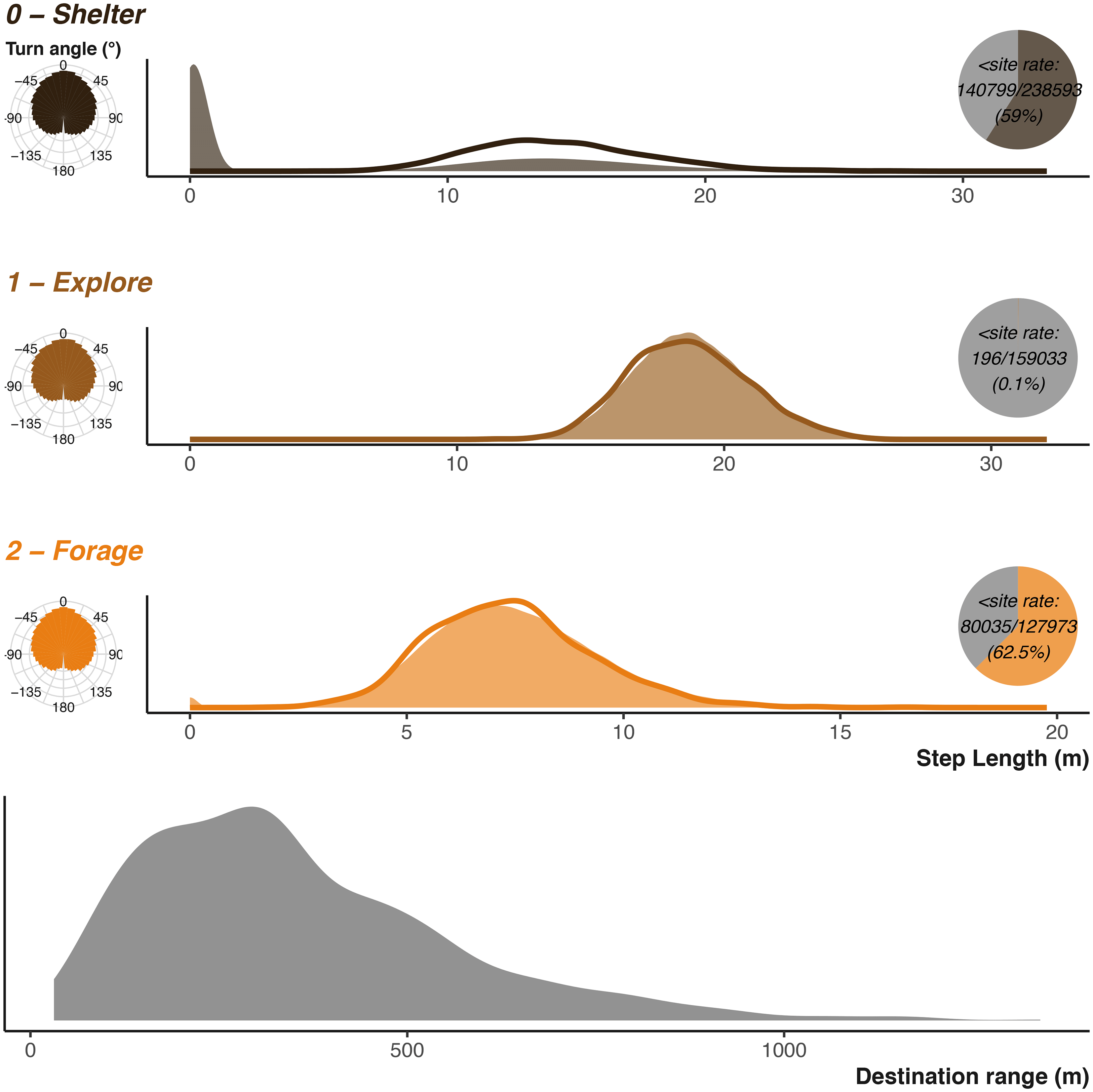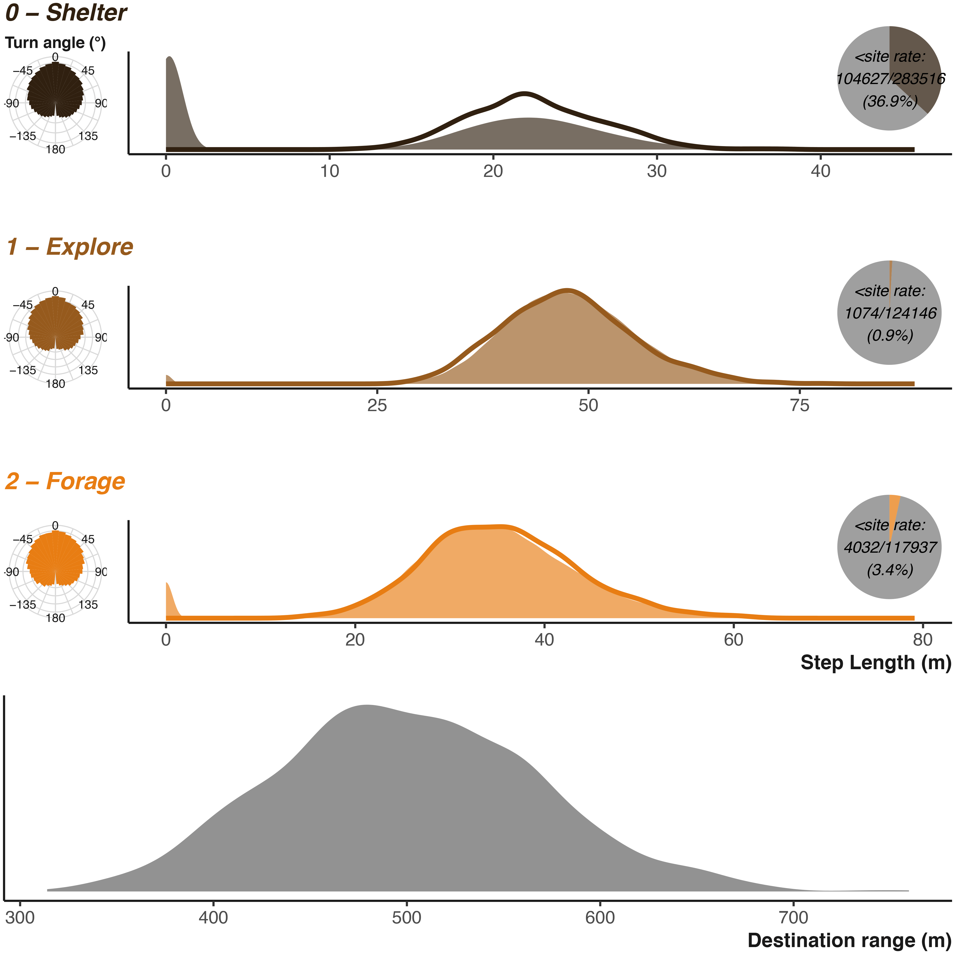 Parametrising distributions are shown as solid areas using the same shape and scale parameters used as input into the simulation function. The lower plot shows the distribution used to generate potential foraging destinations. The realised resulting simulated step lengths (scaled to the input units) are shown by the solid lines. The realised resulting turn angles are shown in left hand sub-plots. Inset pie charts show the number of step lengths that were below the shelter site size. Note that x axis is not consistent between the three plots.