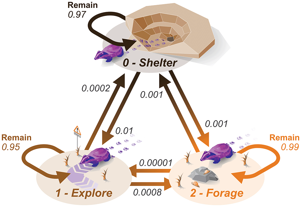 Animals behaviour is frequently expressed via cycles, such as day/night or diel cycles61; therefore, we want the transition matrix to vary over time. We describe a number of cycles (or waves) that can be applied to the core transition matrix impacting the probability of entering sheltering behaviour. For example, a diel cycle can be expressed via a Sine wave with a frequency of 12 hours and an amplitude of 0.1. At each time step, we draw a value from the wave and add that weighting (from -0.05 to 0.05) to the transition probability of entering sheltering state (row 1, column 1 of the matrix); therefore, the probability of sheltering will increase and decrease following the Sine wave at a approximately 12 hour activity pattern. We can define as many cycles as needed, with varying frequencies, and they impact the sheltering probability additively.