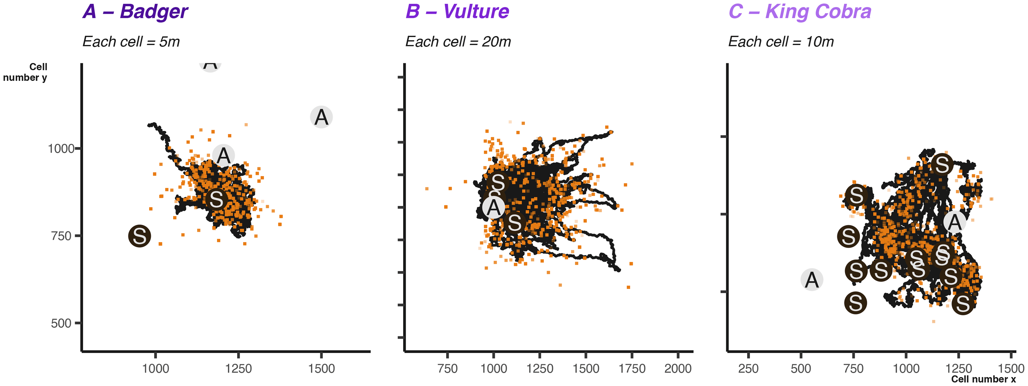 We can review how the movements appear in space. With the badger example, the impact of the avoidance points is clearly visible [ Figure 5A], whereas the lack of or weaker avoidance in vulture [ Figure 5B] and king cobra [ Figure 5C] makes the avoidance less influential. The vulture’s movements and chosen foraging locations are largely to the east, demonstrating the impact of the underlying foraging quality environmental layer. The king cobra plot shows the impact of a near impermeable barrier truncating the southward movements.