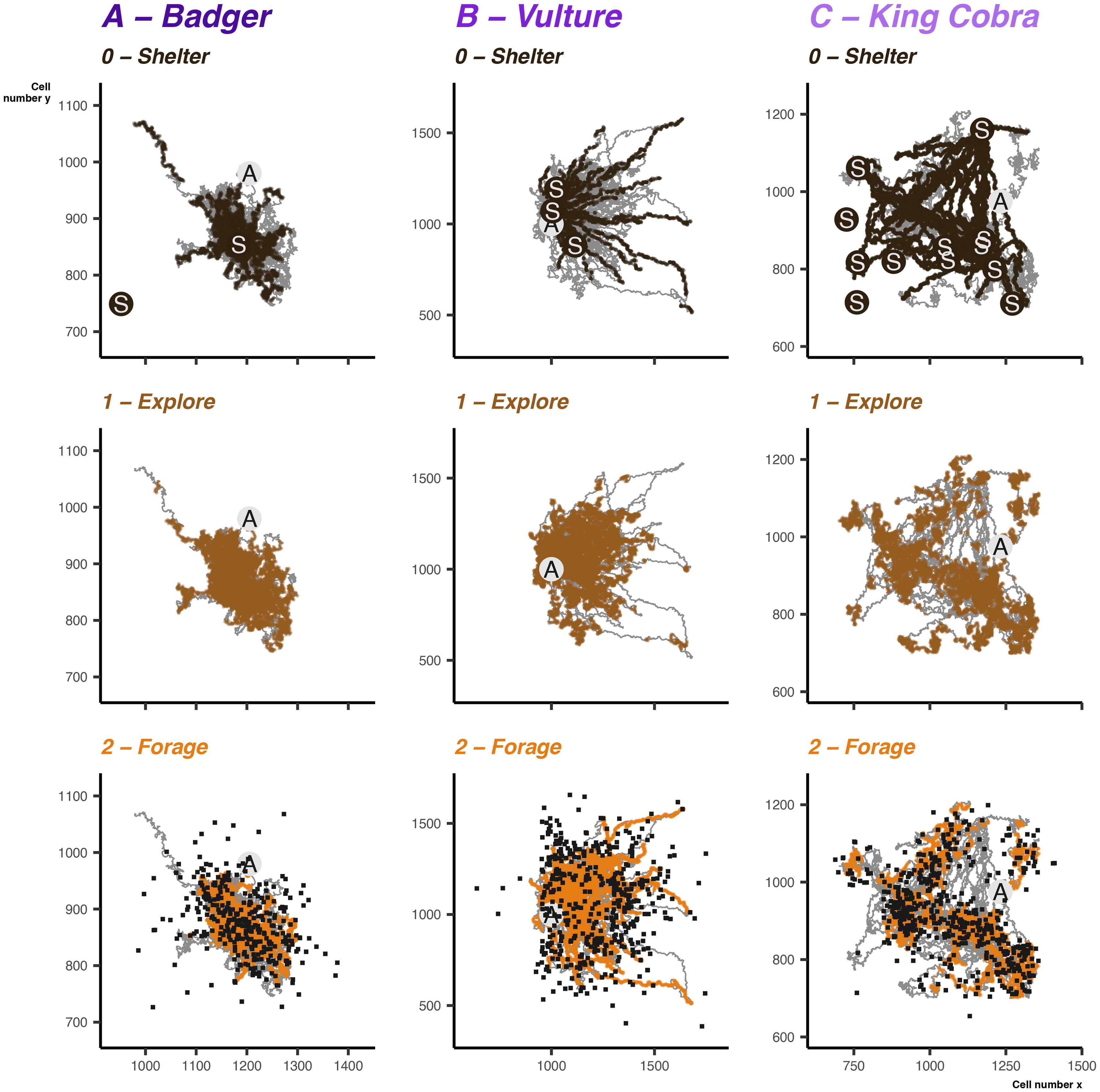 Grey path shows the overall movement during that month, overlaid points indicate where the animal was in a given behavioural mode. Circles with an interior S show the shelter site locations, and cricles with an interior A show the avoidance points, black squares show the dynamically selected foraging destinations. Note that the size represented by each unit on the x and y axis differs depending on the species.