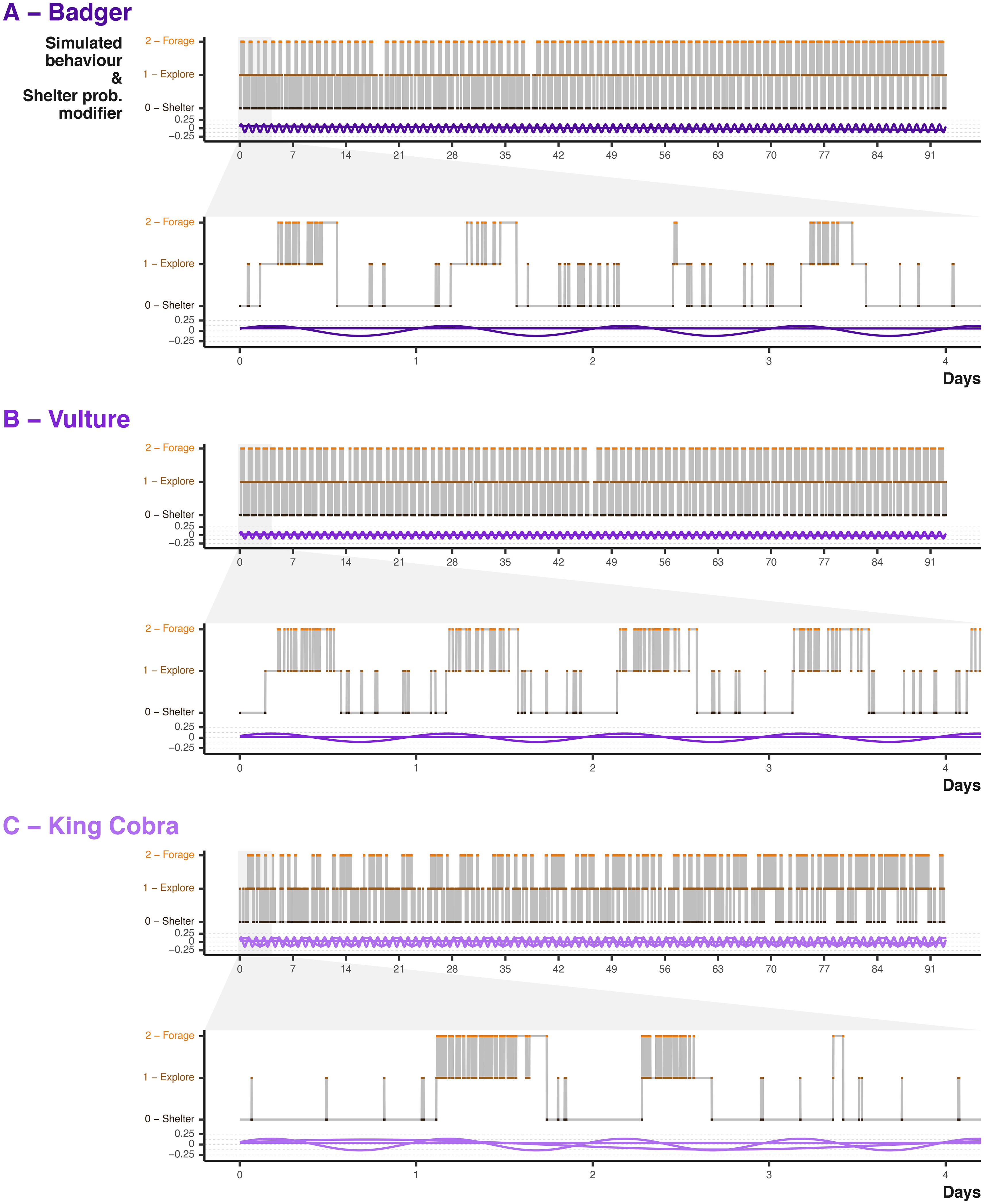 The activity cycles and the timing of behavioural shifts is a key component in the simulations. We can examine that the predefined cycles result in expected patterns. A year of data makes observing all but the broadest cycles difficult, so in Figure 7 we can look at several months of data as well as the daily cycle. Badger and vulture daily cycles are largely the same [ Figure 7A & B], with a consistent daily activity cycle differing only slightly in the time spent active and balance between shifts from sheltering to foraging and exploring. Some of the differences are a result of the different behavioural transition matrices provided to simulate the two species, where both had different baseline probabilities of shifting between behavioural states. By contrast, the king cobra example demonstrates the interaction between the daily and weekly cycles [ Figure 8]. We can see intermittently extended sheltering periods, punctuated by short exploratory or foraging bouts.