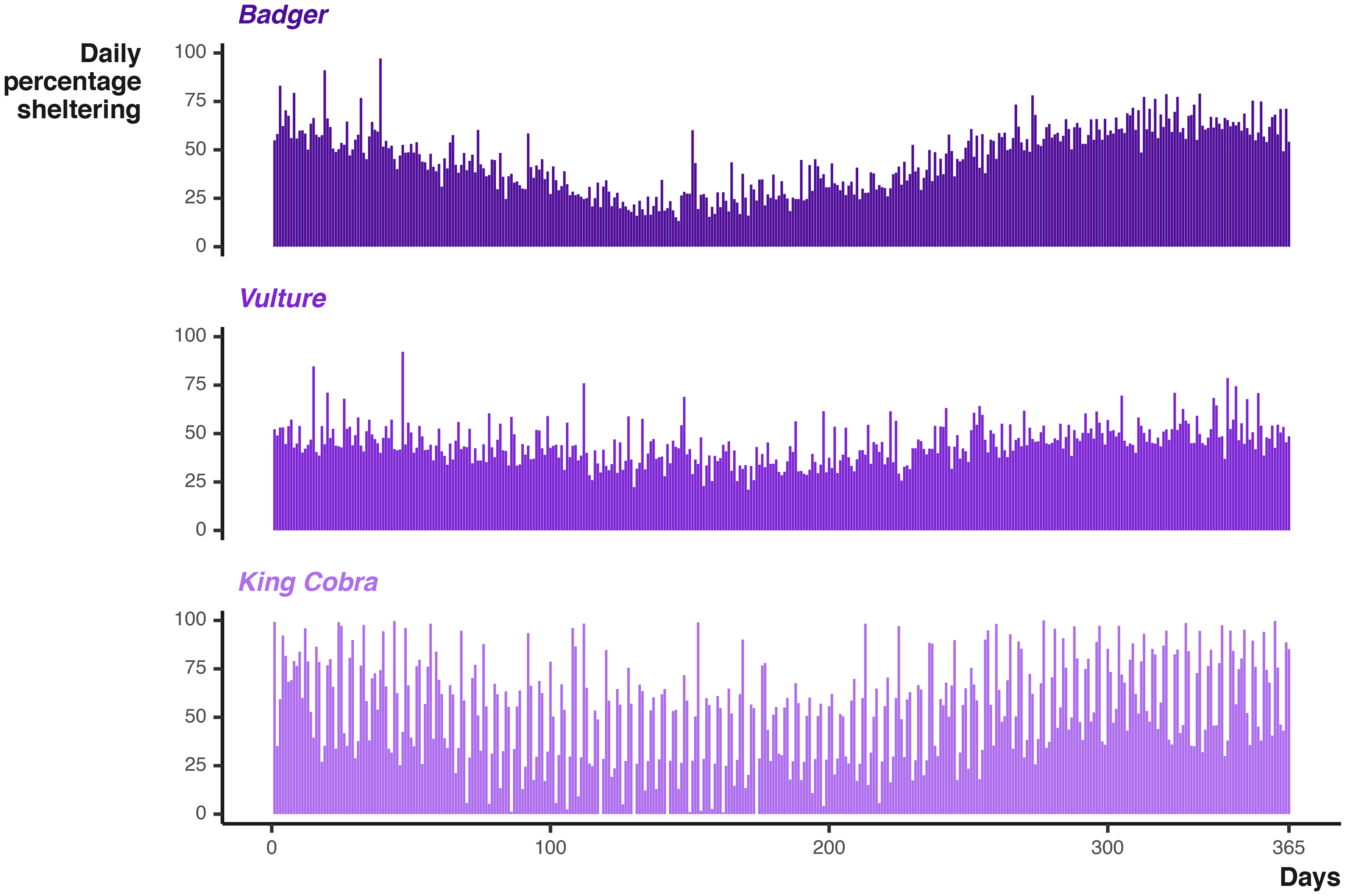 At the daily and monthly scale, we cannot see the impact of the broad scale seasonal cycles. Instead we can look at the percentage of time steps per day the animal was in sheltering behaviour [ Figure 9]. Again the Badger and Vulture sheltering rates are similar, differing in intensity, but with both demonstrating a seasonal decrease in the middle of the simulation. The king cobra cycles reveal decrease in the number of days spent entirely sheltering and an overall impression that the seasonal cycle is less influential (as it is only one of three activity cycles).