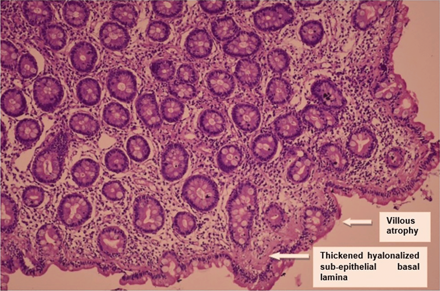 Duodenal biopsy showed subtotal villous atrophy with increased intraepithelial lymphocytosis and a very thickened hyalonalized sub-epithelial basal lamina: an appearance suggestive of sprue (Figure 2).