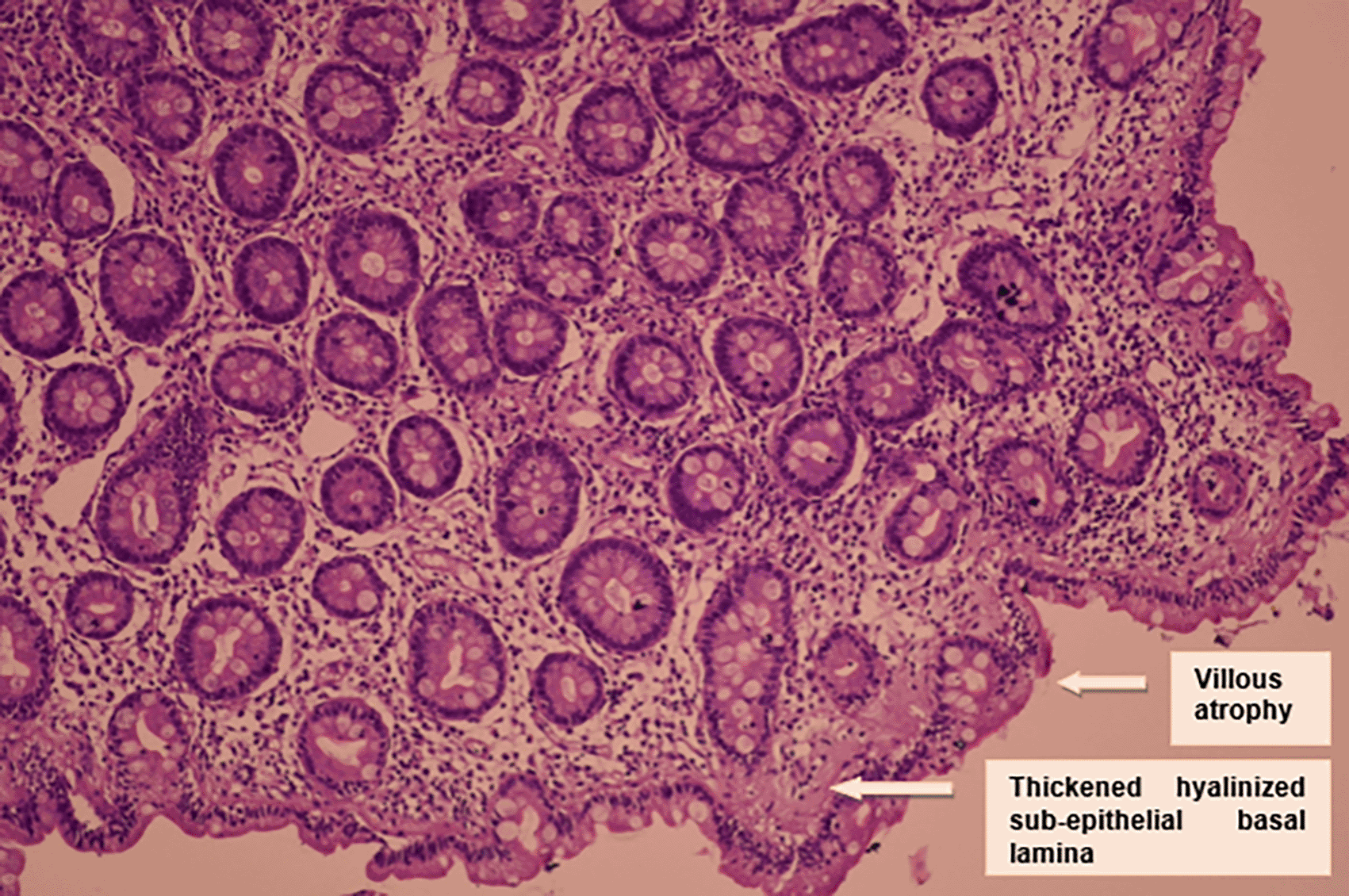 Duodenal biopsy showed subtotal villous atrophy with increased intraepithelial lymphocytosis and a very thickened hyalinized sub-epithelial basal lamina: an appearance suggestive of sprue (Figure 2).