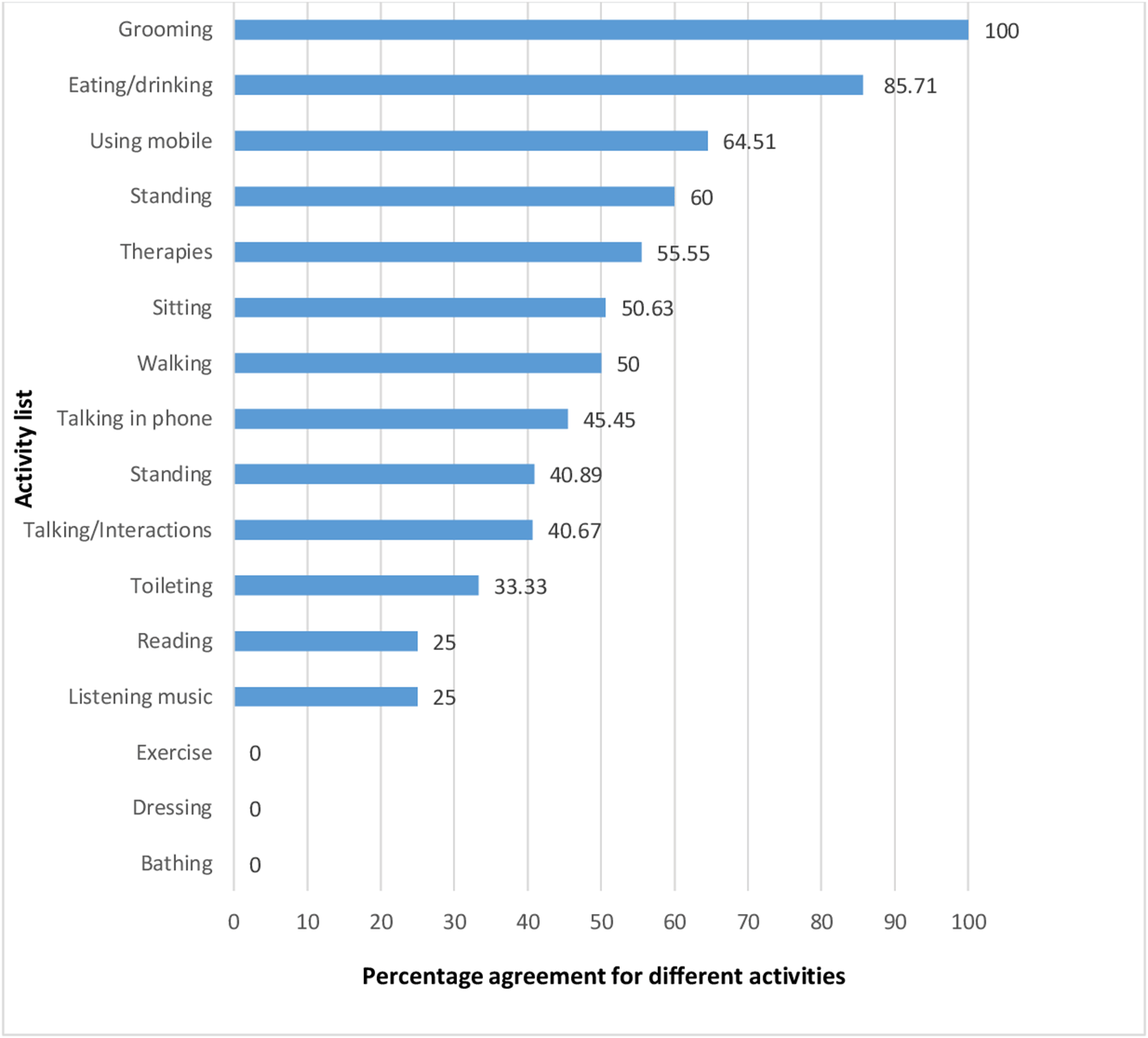 Agreement between caregivers and physiotherapist varied significantly for different activities as it ranged from 0% (lowest) for bathing, dressing and 100% (highest) for grooming. The percentage agreement for different activities monitored by caregivers and physiotherapist are shown in Figure 1. Further, the agreement of activities under physical, cognitive and social domains were 42, 38 and 43%, respectively.