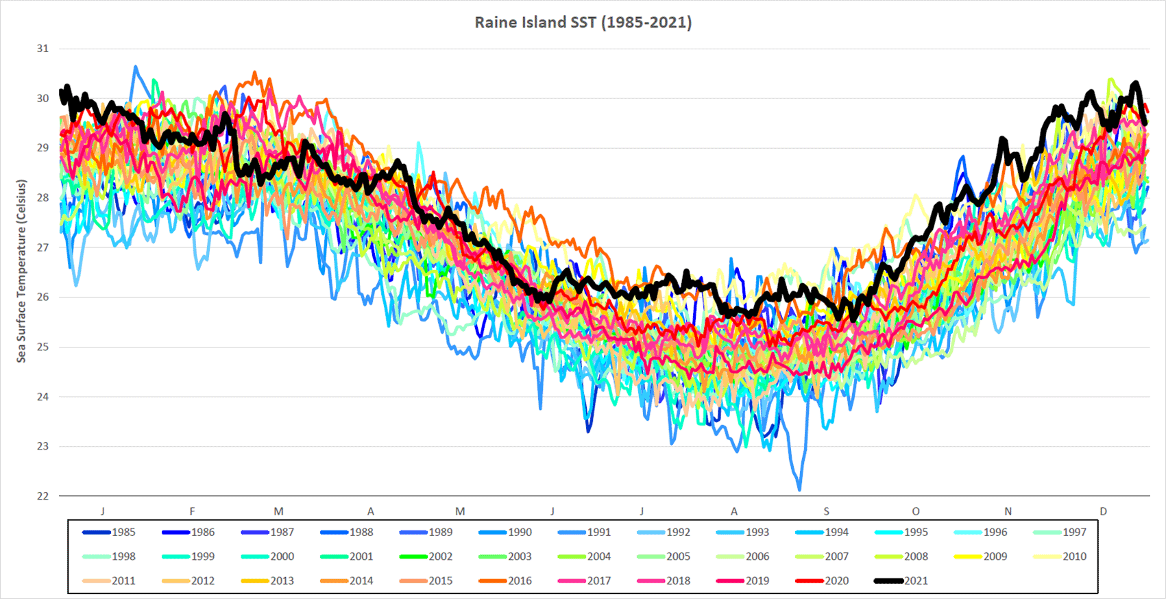 We defined the background temperature for a given date as the minimum SST for a pixel over the 29 days prior to and including the given date, which is the period of a full tidal cycle. The background temperature for 14 December (minimum SST from 16 November to 14 December) for each year, 1985-2021, was determined for each GBR reef pixel. The all-time maximum SST from 1985-2020 over the same 29-day period was also determined for each GBR pixel. This was then used to compare background temperatures among years as well as to determine the proportion of GBR pixels in which the background temperature on 14 December 2021 was greater than the maximum SST between 16 November and 14 December for all years from 1985-2020.