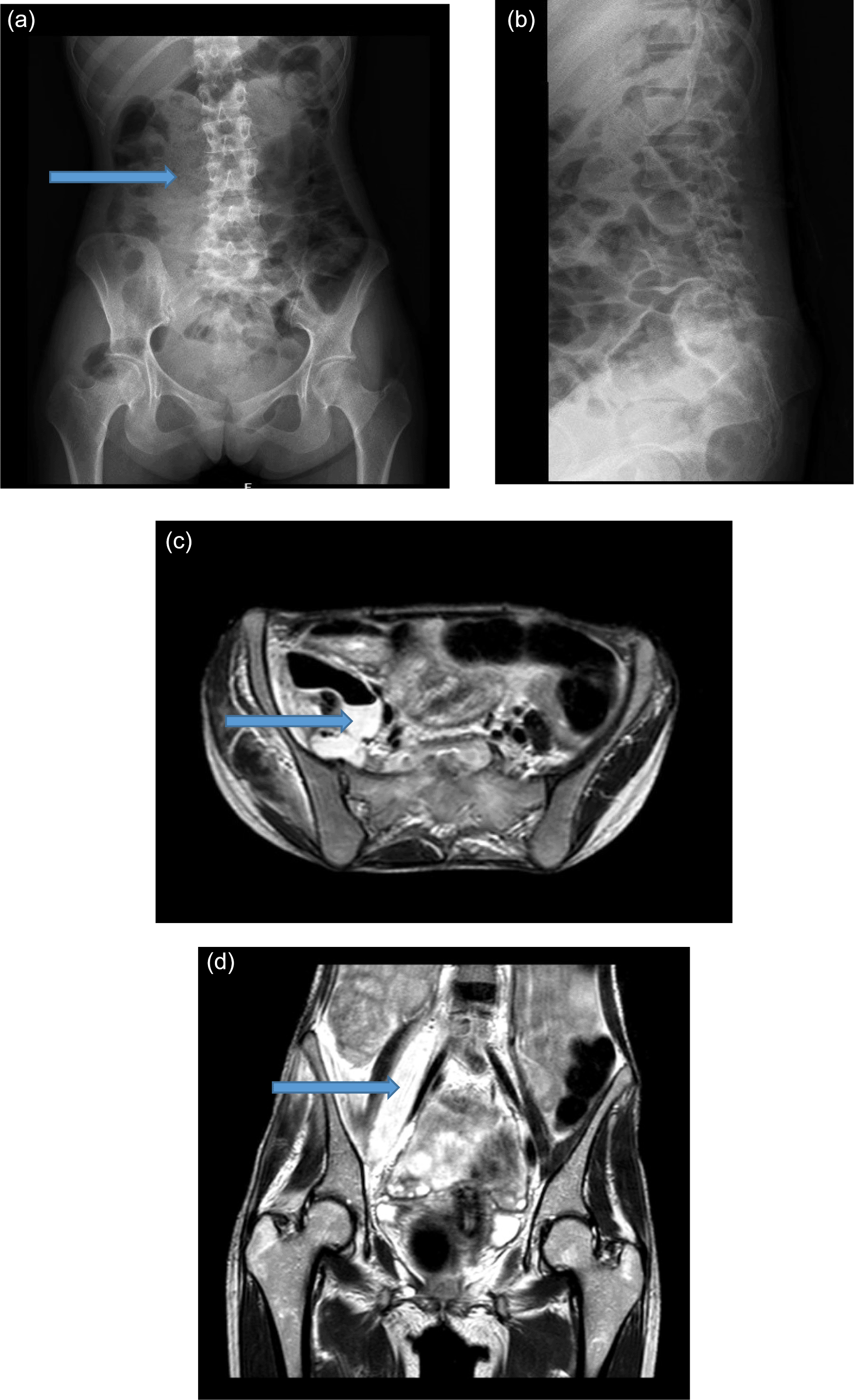 A radiograph revealed mild lumbar scoliosis to the left side and bulky psoas muscle in the right side (Figure 1a and b).