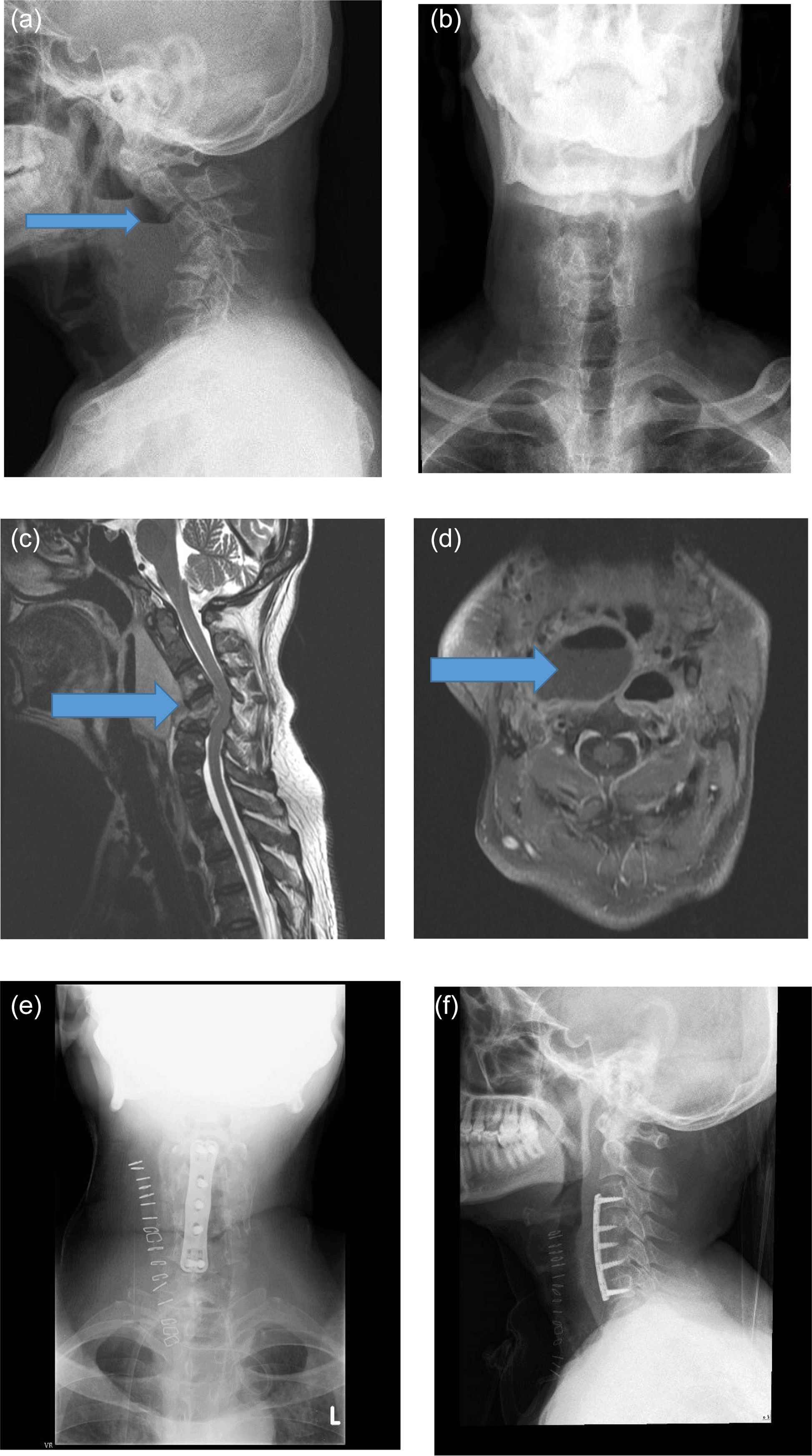 MRI of the cervical spine confirmed spondylodiscitis of C4-C5 with cord compression. Multiple collections in parapharyngeal space communicating with the pre-vertebral space were also seen along with air-fluid levels (Figure 2c and d)