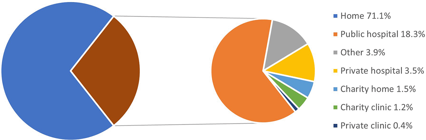 Over the period of 1st June 2021 to 31st August 2021, the proportions of death ranged between 12.4% and 17.3%, with less variations throughout, despite the peak occurrence of COVID-19 in July week 2 (Figure 1). The majority of deaths (72%) happened at home and 18.3%, at public hospitals (Figure 2).