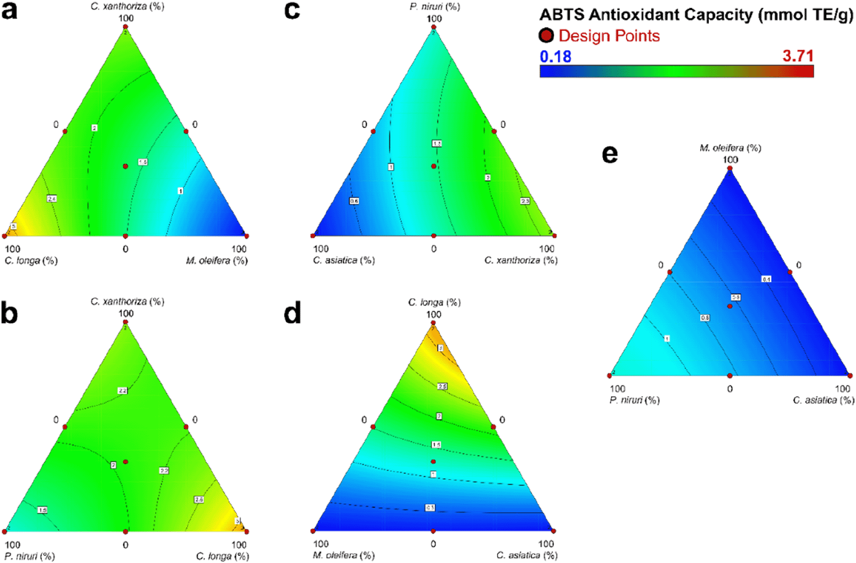 The ABTS assay was also applied to assess the antioxidant activity of the five plants and their combination using the HET approach, which is similar to the DPPH assay. However, it differs from the DPPH assay. It uses a water-based solution for evaluating the antioxidant activity. The results indicated a different pattern of antioxidant activity, particularly at the gap between the low and high potential antioxidant profiles. As discussed above, the antioxidant properties of single-component and poly-combination were affected by the biological activity and interaction of components in the extract (Abbas et al. 2021). The interaction between C. longa and C. asiatica showed the synergistic effect through interaction between primary marker compounds—curcumin and asiaticoside. According to the results, C. longa made the most outstanding contribution to the antioxidant capacity. The use of a contour plot can be applied for a visual evaluation of the effect of each combination and interaction between two extracts simultaneously.