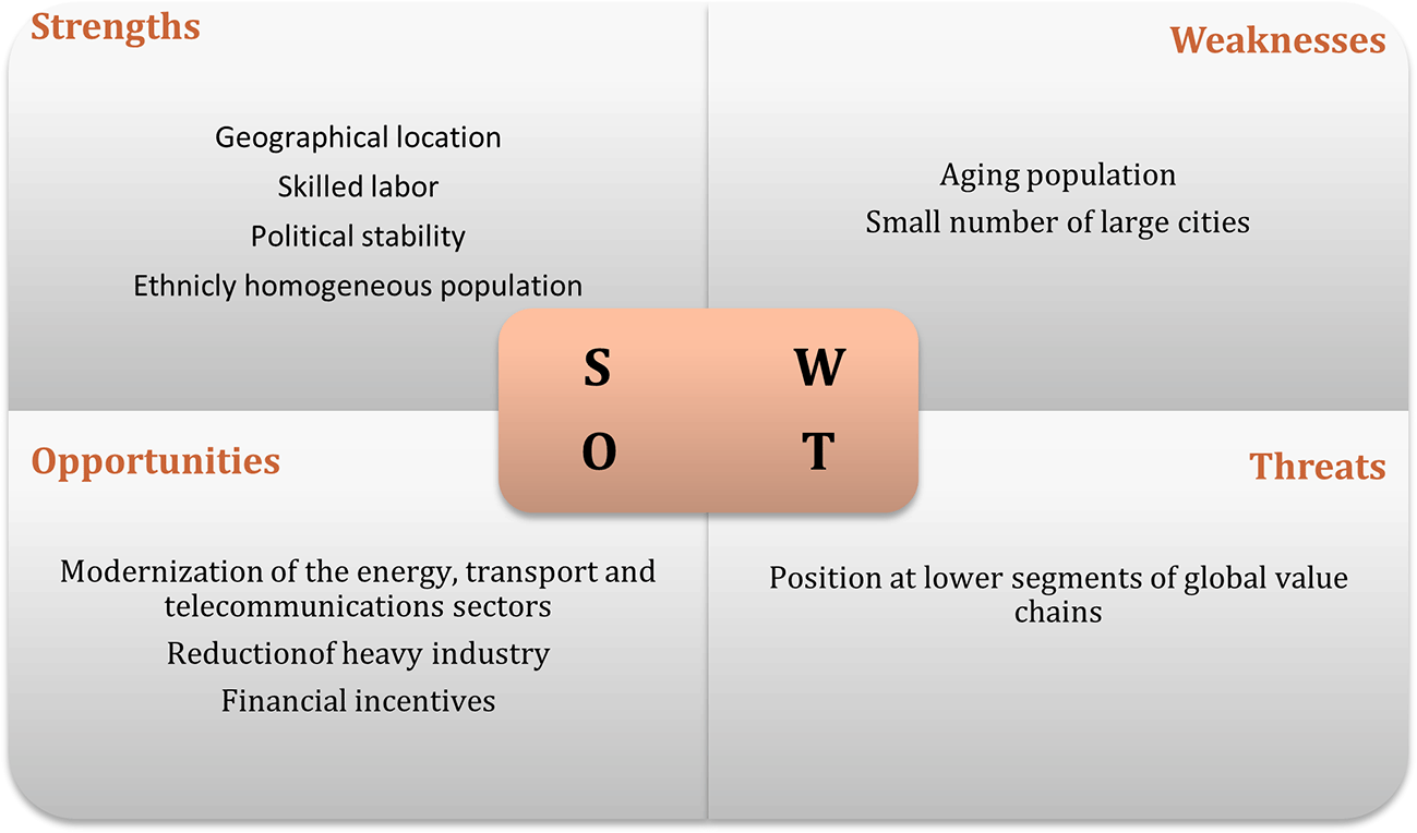 However, Poland displays six strengths, against five for Hungary and three the Czech Republic. Concerning threats, Poland and Hungary share the same: position and low segments of the global value chain; while the Czech Republic presents as threats, some issues related to the political process.