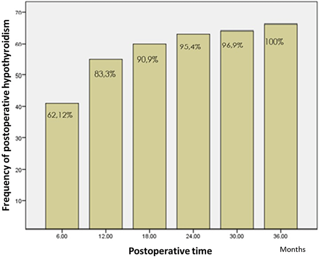 The time to develop clinical hypothyroidism in our study was 12 months for 83.3% of the patients. This is consistent with most of the studies found in the literature, and most patients develop it at 12 months.2 In a study by Al-Shalhoub et al., hypothyroidism was diagnosed in the first 6 months in 70% of patients.18 It appeared in the first 3 months after surgery in 84.5% of cases and after 9 months in 91.2% of patients.5