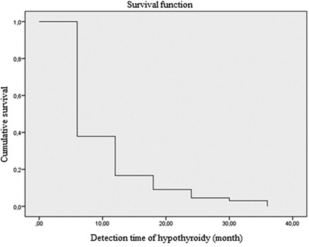 Regarding the time to onset of postoperative hypothyroidism, 62.1% of the patients were diagnosed using laboratory tests in the first 6 months, and 83.3% of the patients within the first year of monitoring (Figures 2 and 3). The average time to the occurrence of this complication was estimated at 10 months (IC 95% 8.5-12.04).