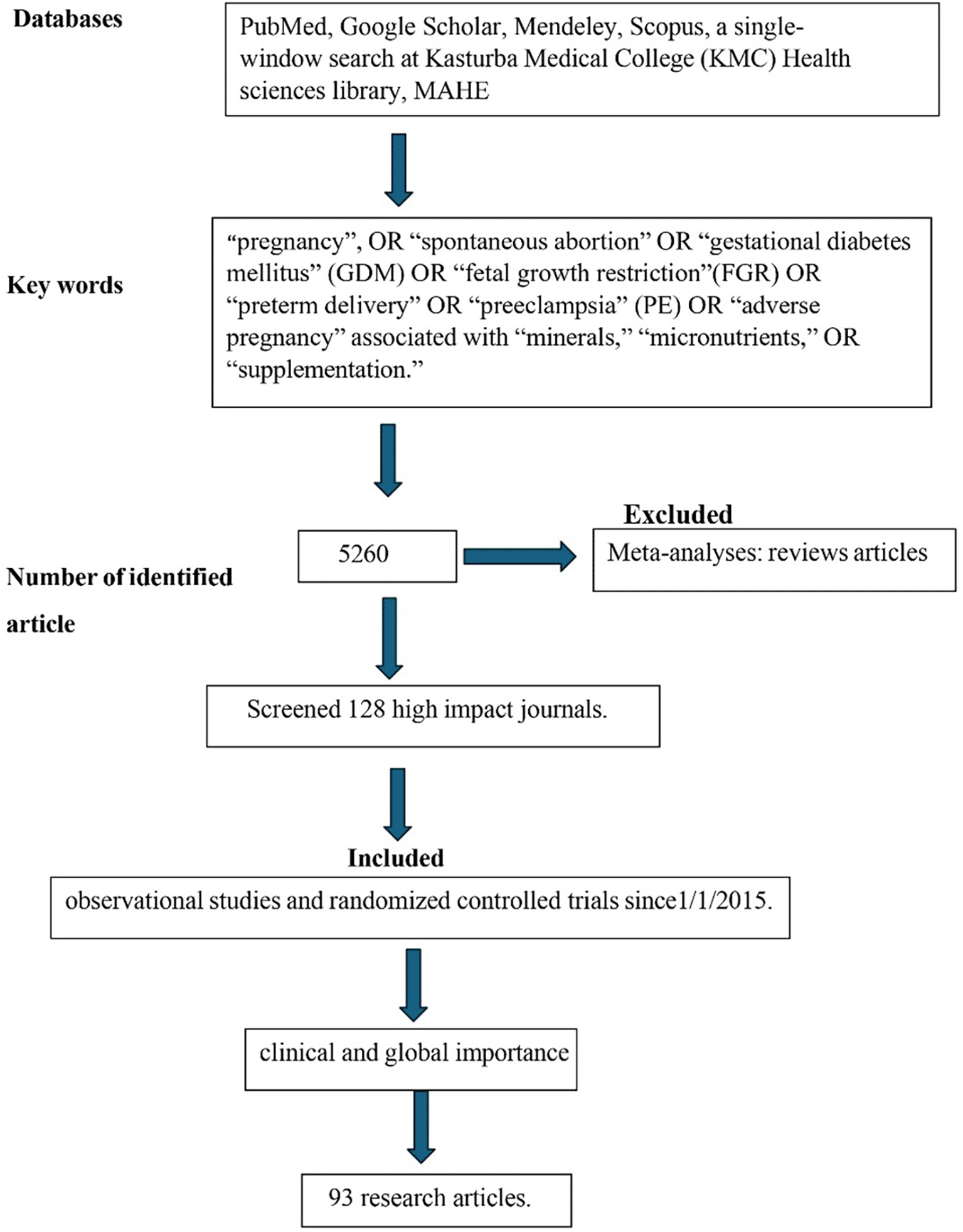 The study used a literature search using PubMed, Google Scholar, Mendeley, and Scopus Databases using search words “pregnancy”, OR “spontaneous abortion” OR “gestational diabetes mellitus” (GDM) OR “fetal growth restriction” (FGR) OR “preterm delivery” OR “preeclampsia” (PE) OR “adverse pregnancy” associated with “minerals,” “micronutrients,” OR “supplementation.” The review also considered in-house literature databases, a single-window search at Kasturba Medical College (KMC) Health sciences library, MAHE (Manipal Academy of Higher Education). As mentioned above, we identified 5260 articles with the search criteria (Figure 1). The study specifically screened 128 high impact journals such as The American Journal of the Medical Science, Journal of Trace Elements in Medicine and Biology, Nutrients, etc. and included 93 research articles. The review evaluated observational studies and randomized controlled trials since1/1/2015. Meta-analyses: reviews were excluded from this study. For clinical and global importance, the review chose the referred studies.