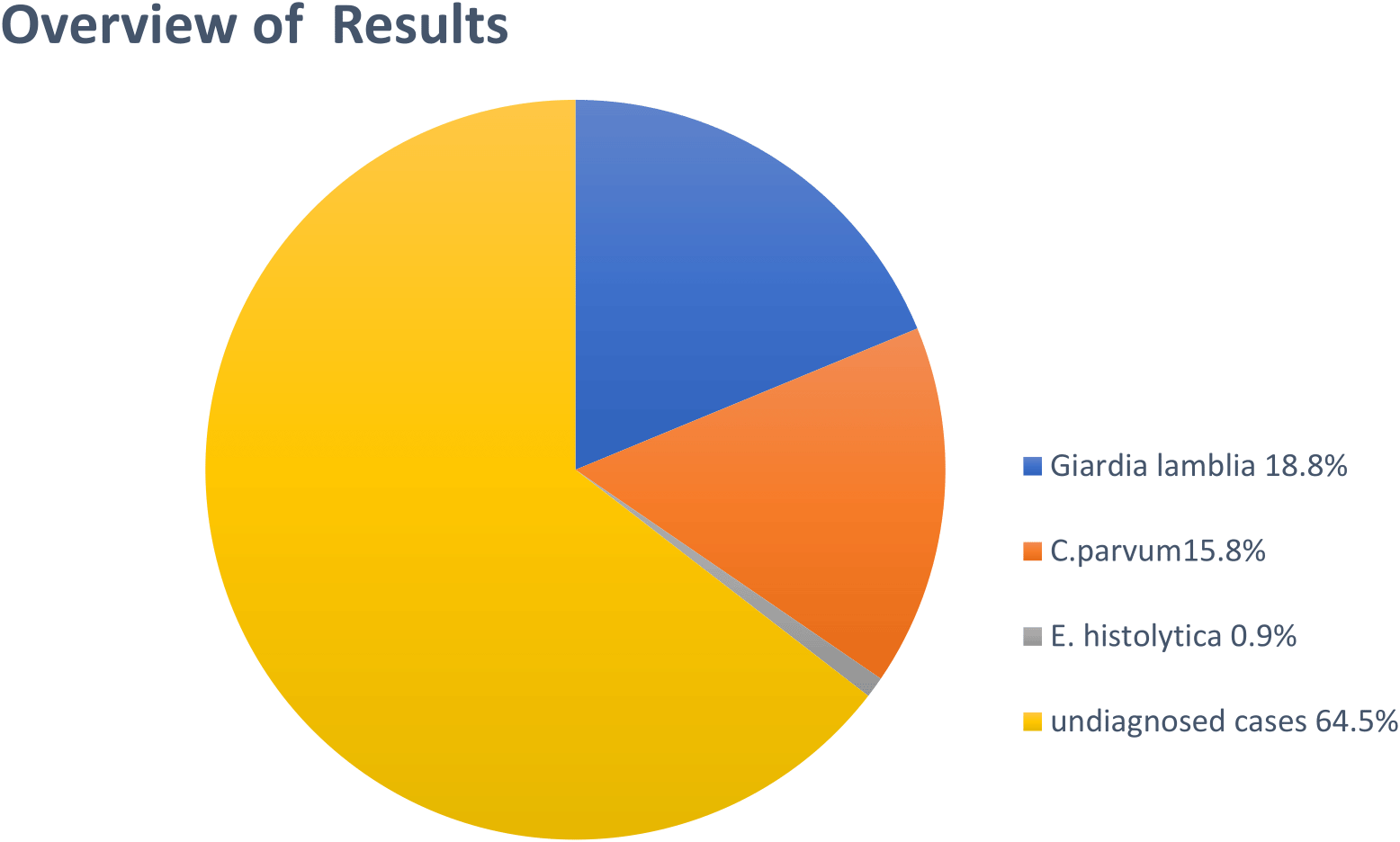 A potential protozoal parasite was diagnosed in 155/437 (35.5%) cases, among which the highest prevalence was G. lamblia (82/437, 18.8%), followed by C. parvum (69/437, 15.8%), and E. histolytica (4/437, 0.9%) No protozoan pathogen was detected in 282 (64.5%) diarrheal cases (Diagram 1).