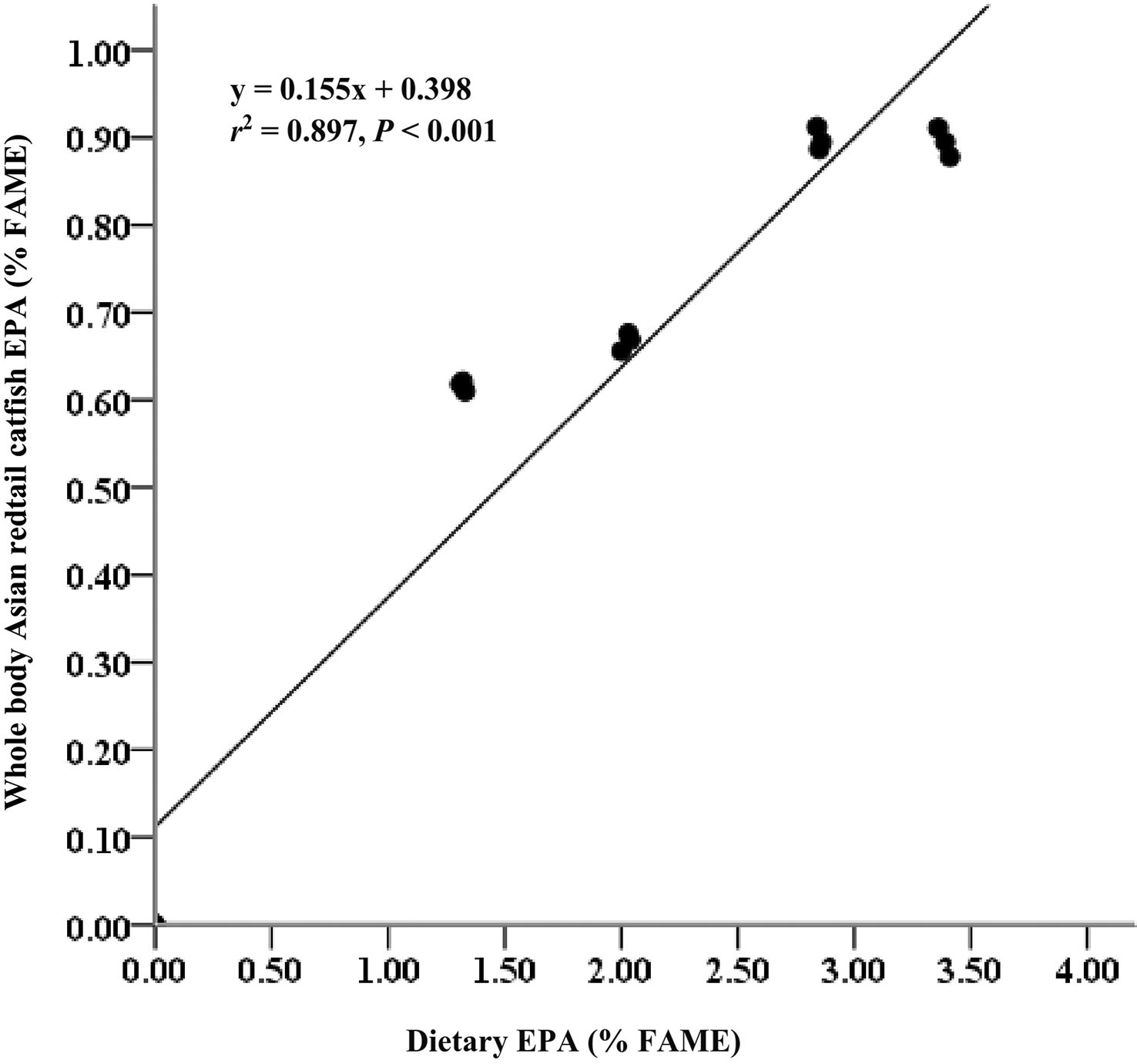 The current study showed that Asian redtail catfish (Hemibagrus nemurus) fed feed supplemented with different levels of EPA and DHA obtained from fish oil contained higher EPA and DHA than control feed (D1). These results match those for other fish species.4,6,7 The EPA and DHA contents in the diet had strong relationships with the EPA and DHA contents in whole-body carcasses (r2 = 0.897 for EPA and r2 = 0.812 for DHA). This fact showed that adding EPA and DHA to the feed positively contributed to the EPA and DHA in the carcass of Asian redtail catfish. Regarding PUFAs, Asian redtail catfish freshwater can be considered a good source of n-3 series fatty acids, especially EPA and DHA, which have the highest content in fish fed a D3 diet. However, the levels were low, in line with the contents of EPA and DHA for Atlantic salmon freshwater fish,10 Nile tilapia,7 and common carp, Rohu, and tilapia.40 However, this level of EPA and DHA in freshwater finfish is lower than that in seawater finfish, such as sea bass and other fish species.5,39