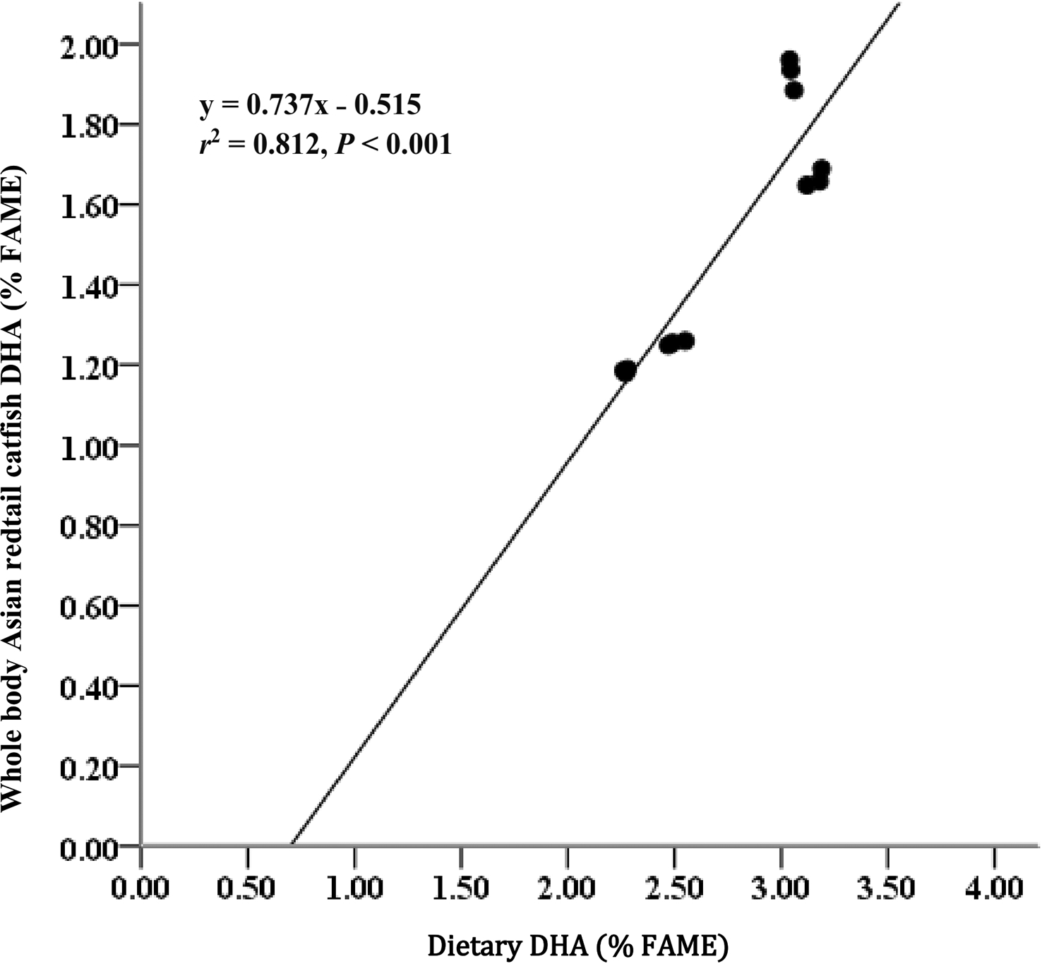 To determine the trial effect of supplemented EPA and DHA in diets, body meat, growth performance, body indices, and serum metabolite variables were measured using one-way ANOVA. The data from the experiment were analysed using SPSS (RRID:SCR_002865) 16.0 software package (SPSS, Chicago, IL). The data homogeneity was analysed with Levin's test and followed up with the post hoc Duncan’s multiple range test.32 Relationship between dietary EPA and DHA with whole-body meat; glucose levels, TAG levels, and LDL-C levels were analysed using Regression with curve estimation. For the figures presented, Microsoft Office Professional Plus 2019 was used.