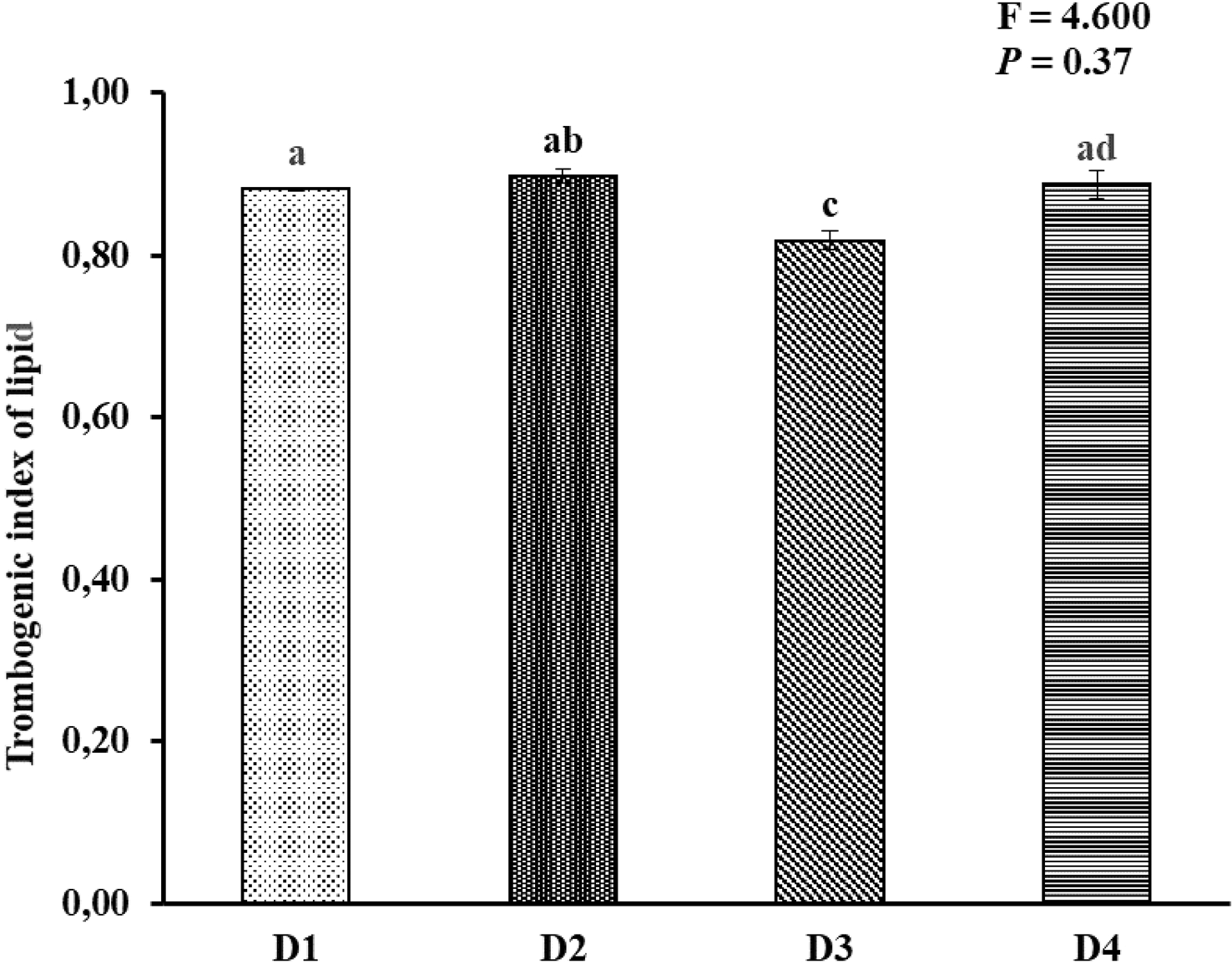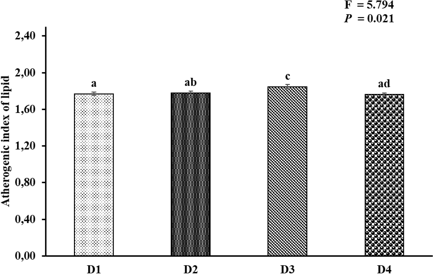 In the current study, the atherogenic index (AI) ranged from 1.76 to 1.84, and the thrombogenic index ranged from 0.81 to 0.89 in all whole-body carcasses fed feed D1, D2, D3, and D4. This appeared to be connected to a discrepancy in SAFA compositions among experimental diets. The AI levels in the whole-body carcasses of Asian redtail catfish fed feed D1 and D2 and D4 were insignificant, while fish fed feed D3 differed in D1, D2, and D4. The AI and thrombogenic index (TI) indices were significantly associated with the content of myristic acid (C14:0), palmitic acid (C16:0), and stearic acid (C18:0), all of which are thrombogenic promotors.7 The Food Agricultural Organization and the Health World Organization recommend AI and TI values between 0.4 and 0.5. Even though the AI and TI scores of the Asian redtail catfish were higher than 0.5, we stated that consuming Asian redtail catfish flesh is a healthy food. In fish farming, AI and TI indices correlated with feed supplemented with fish oil, including EPA and DHA,7,10 feed quality used,4 fish species, and environmental factors.5,41
