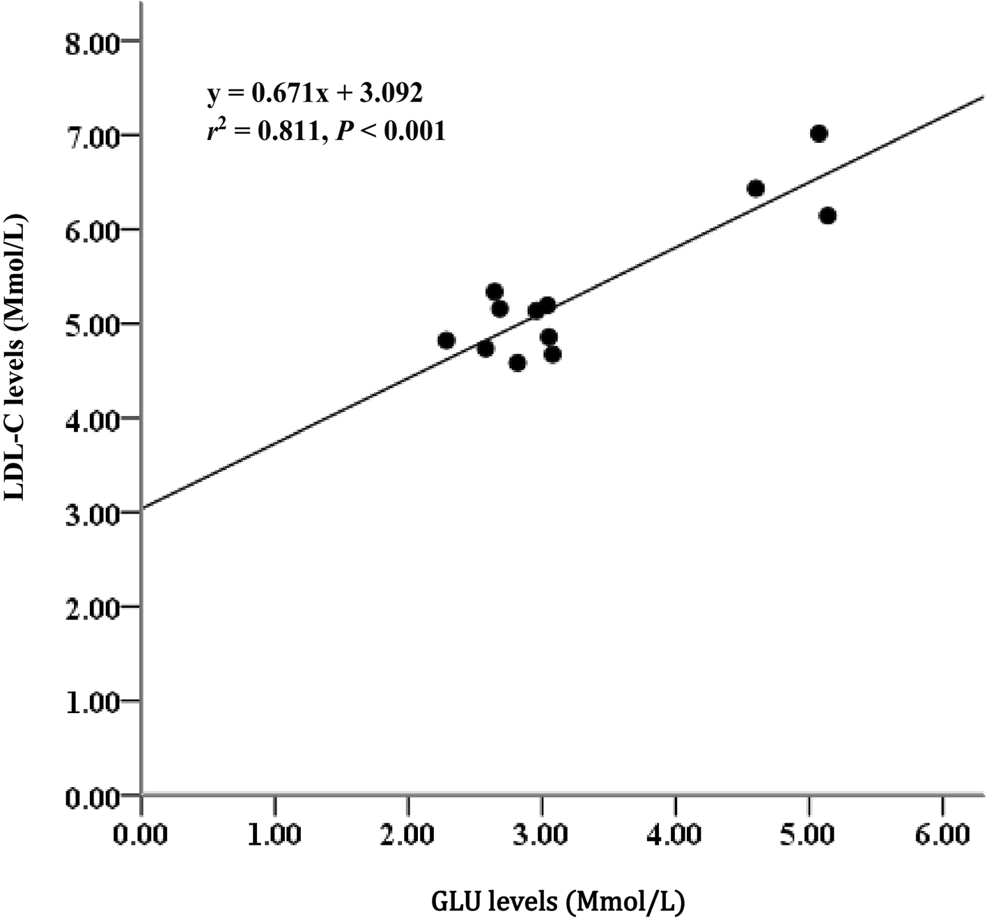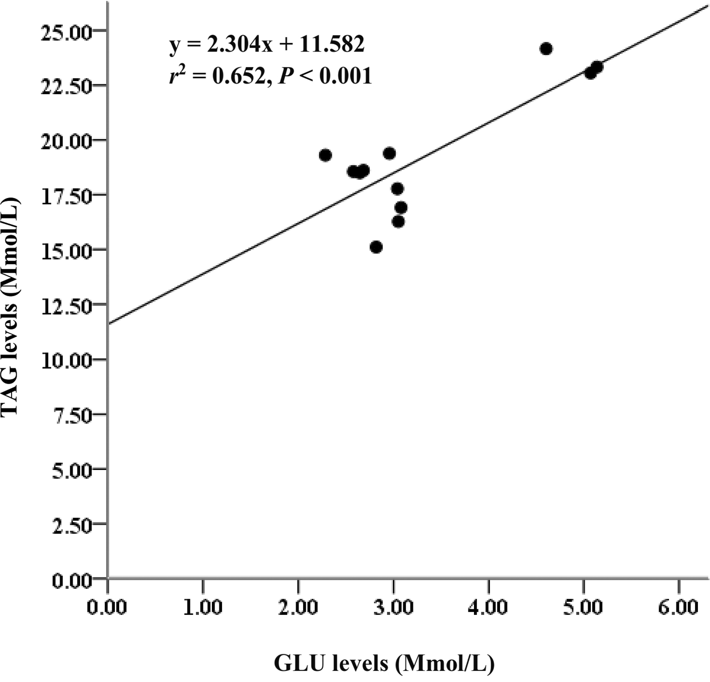 1 Values are presented as means ± SE, n = 3. Note: Numbers followed by different superscript of letters in the same row indicate a significant differences (P < 0.05). Numbers followed by superscript of the same letter in the same row showed no significant difference (P > 0.05). GLU, glucose; TAG, triglycerides; TC, total cholesterol; HDL-C, high-density lipoprotein-cholesterol; LDL-C, low-density lipoprotein cholesterol.