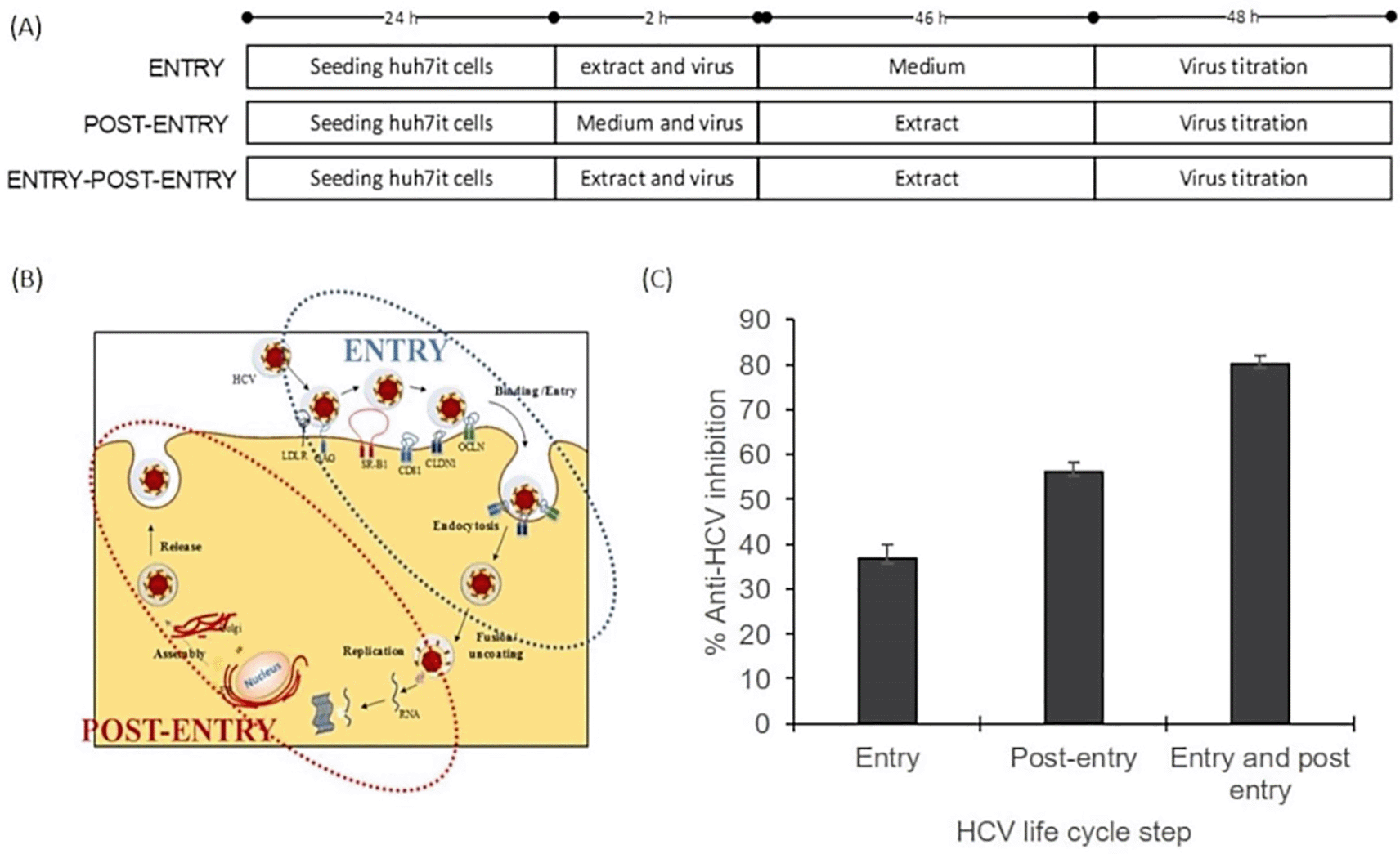 The mode of action assay was performed to examine whether A. mangium extract affected the entry or post-entry step of the HCV life cycle. Three parallel experiments were performed. First, the extract was only added to the cells during viral inoculation. Second, the extract was only added to the cells after viral inoculation. Third, the cells were treated with the extract both during and after inoculation. After 48 h of incubation, all supernatants were collected to examine their viral levels by titration assay. Viral supernatant was diluted with medium and inoculated to the Huh7it cells. Infected cells were calculated to further determine the percentage inhibitory against HCV. Anti-HCV activity was expressed by 50% inhibition concentration (IC50) (Hafid et al., 2017).