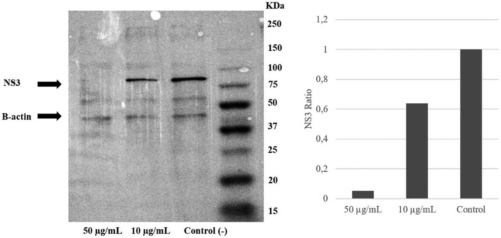To examine the mechanism of action of the ethanol extract, western blotting analysis was performed. The result demonstrated a reduction of the NS3 protein level due to the extract intervention. Immunoblotting revealed that treatment with A. mangium extract at 10 or 50 μg/mL decreased the NS3 protein expression by 40% and 95%, respectively, versus the control (Figure 4) (Underlying data, (Permanasari and Wahyuni, 2022e).