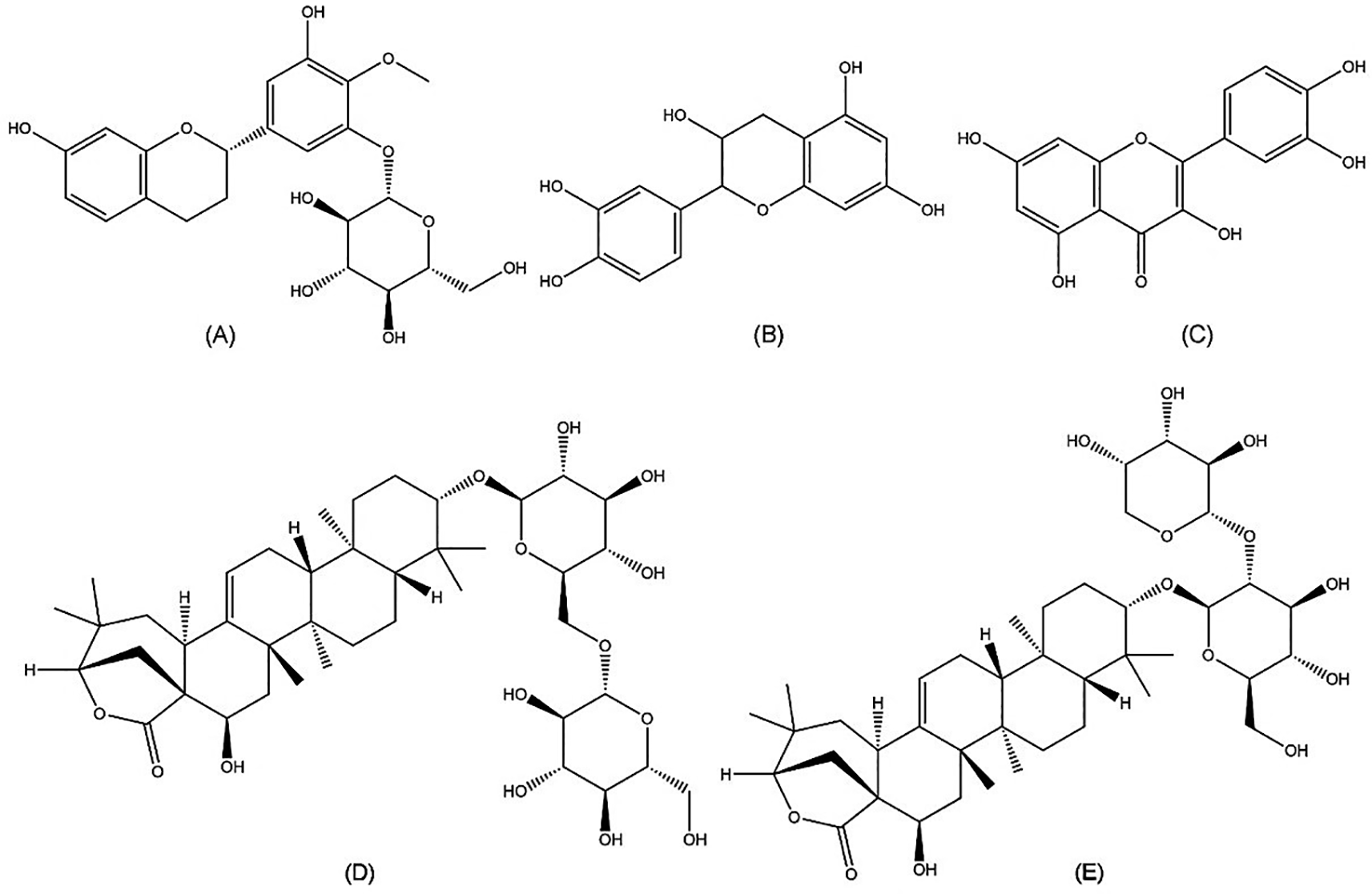 (a) Auriculoside (https://pubchem.ncbi.nlm.nih.gov/compound/Auriculoside), (b) epicatechin (https://pubchem.ncbi.nlm.nih.gov/compound/72276), (c) quercetin (https://pubchem.ncbi.nlm.nih.gov/compound/5280343), (d) proacaciaside I (https://pubchem.ncbi.nlm.nih.gov/compound/102446075), and (e) proacaciaside II (https://pubchem.ncbi.nlm.nih.gov/compound/102446076).