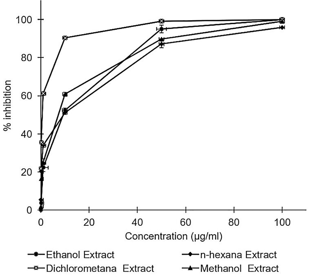 All A. mangium leaf extracts strongly inhibited HCV in a dose dependent manner (Figure 1). Inhibition concentrations of 50% of all extracts were calculated by probit analysis. Dichloromethane extract displayed the strongest effects, with an IC50 of 0.2 ± 0.3 μg/mL, whereas the IC50s of the extracts ranged 2.8–4.6 μg/mL (Table 1). While the positive control of ribavirin revealed the IC50 values of 10.4 ± 0.2 μg/mL. All of the extracts were demonstrated to possess stronger activity compared to the positive control of ribavirin. The raw data are available in the Underlying data (Permanasari and Wahyuni, 2022b).