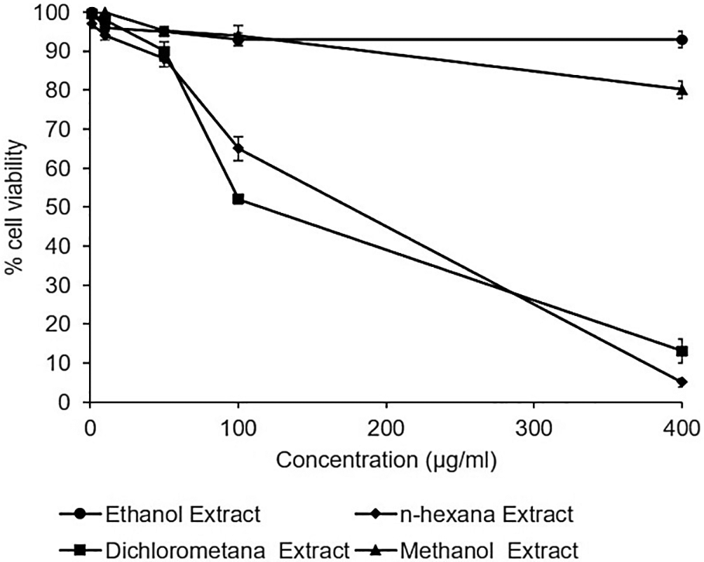 The cytotoxicity assay of the extracts observed no toxic effect in the Huh7it. The percentage of cell viability demonstrated that all extracts possessed cell viability higher than 80% in the concentration of 400 μg/mL. However, n-hexane and dichloromethane extract showed a reduction in the percentage of cell viability at the dose of 400 μg/mL (Figure 2). The raw data are available in the Underlying data (Permanasari and Wahyuni, 2022c).